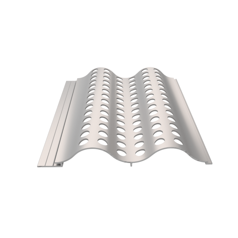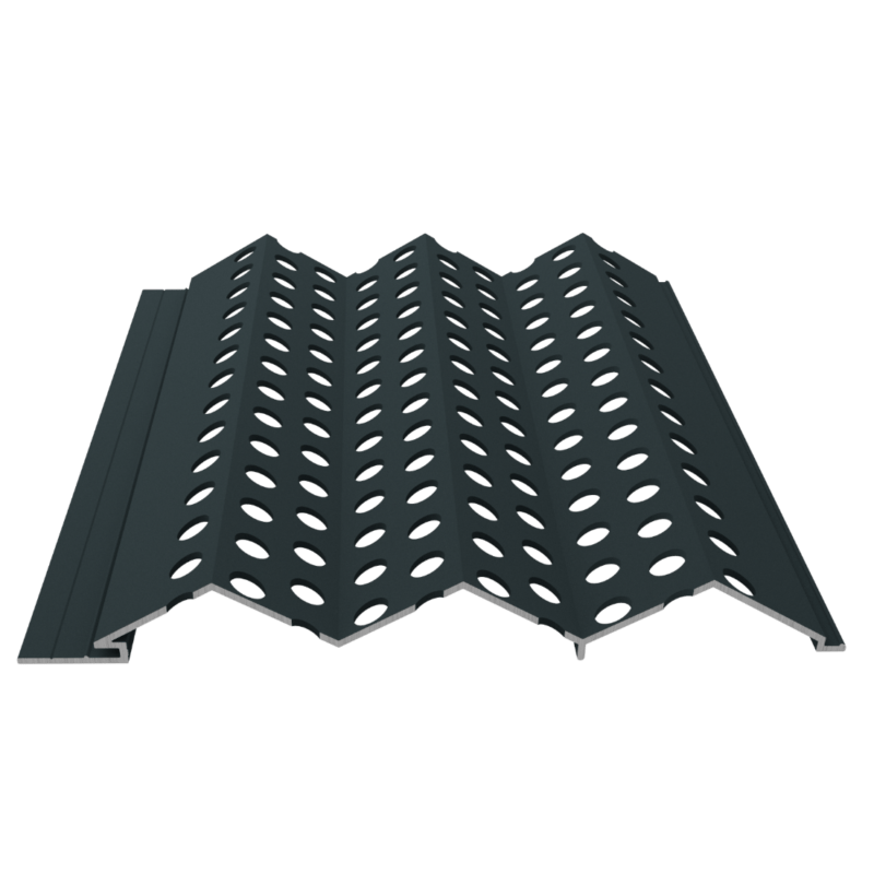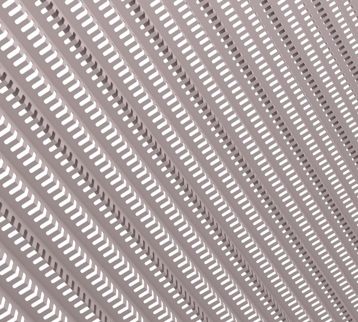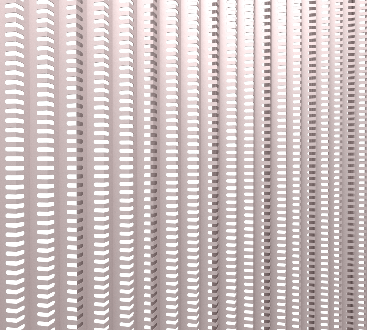Lama de aluminio tipo sierra compatible con diferentes lamas, pudiendo formar así interesantes combinaciones de distintos relieves, para su uso en arquitectura, revestimientos interiores y exteriores y fachadas ventiladas. Cuenta con una perforación rectangular de 30x8. El área perforada es del 28,7%.