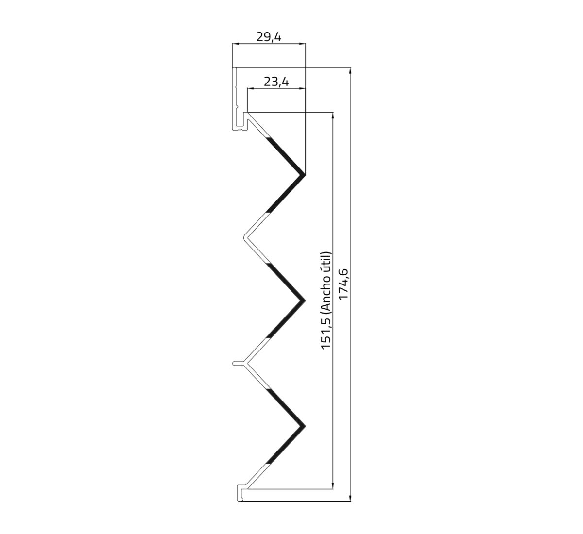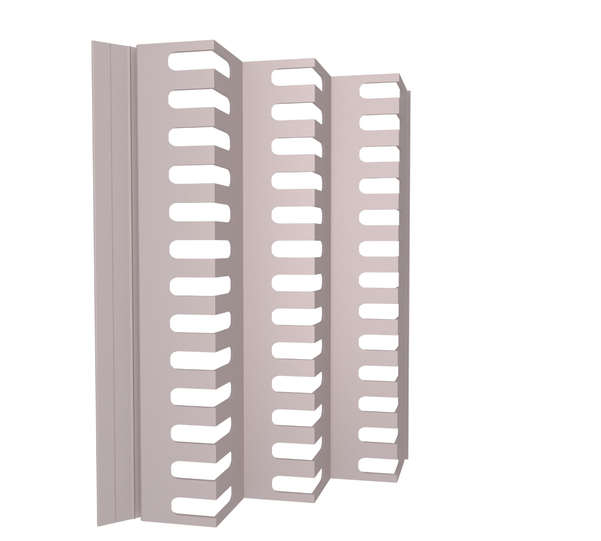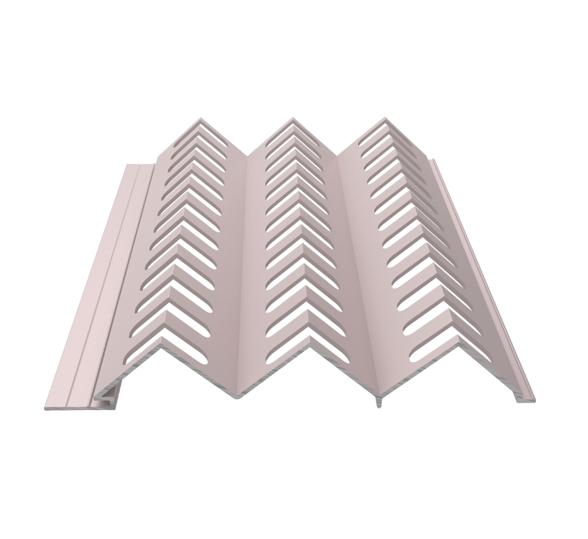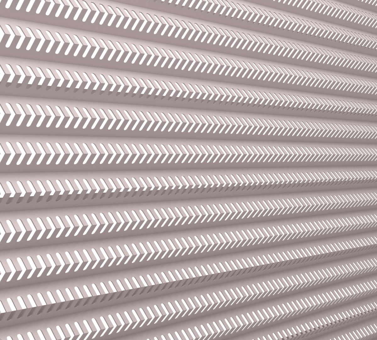 Lama de aluminio tipo sierra compatible con diferentes lamas, pudiendo formar así interesantes combinaciones de distintos relieves, para su uso en arquitectura, revestimientos interiores y exteriores y fachadas ventiladas. Cuenta con una perforación rectangular de 30x8. El área perforada es del 28,7%.