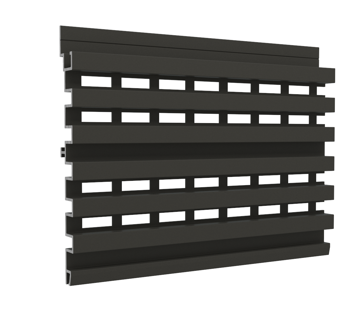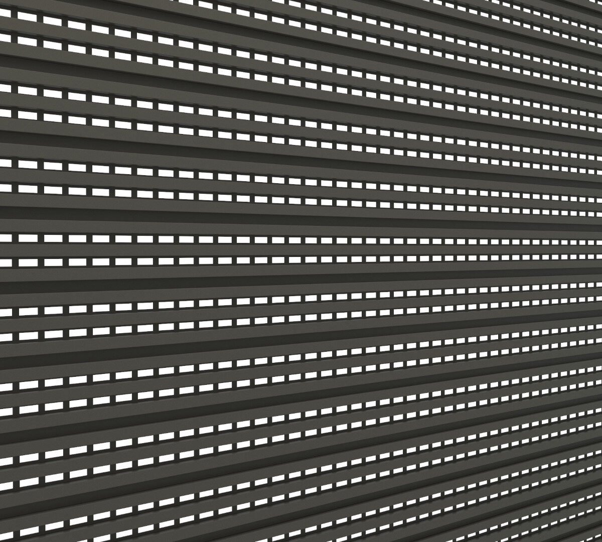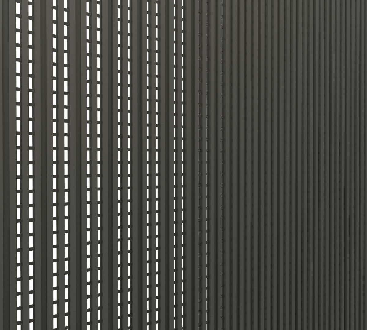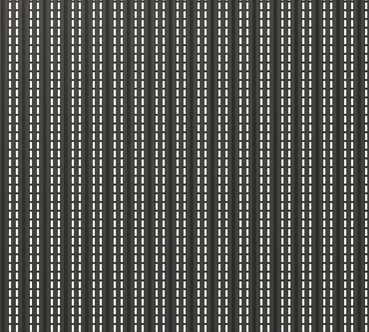 Lame d’aluminium de type grecqué, compatible avec différentes lames, permettant ainsi de réaliser des combinaisons intéressantes de reliefs différents, pour une utilisation en architecture, en bardage intérieur et extérieur et en façades ventilées. Version avec une perforation rectangulaire de 20x6 et une surface approximative de 14,6%.