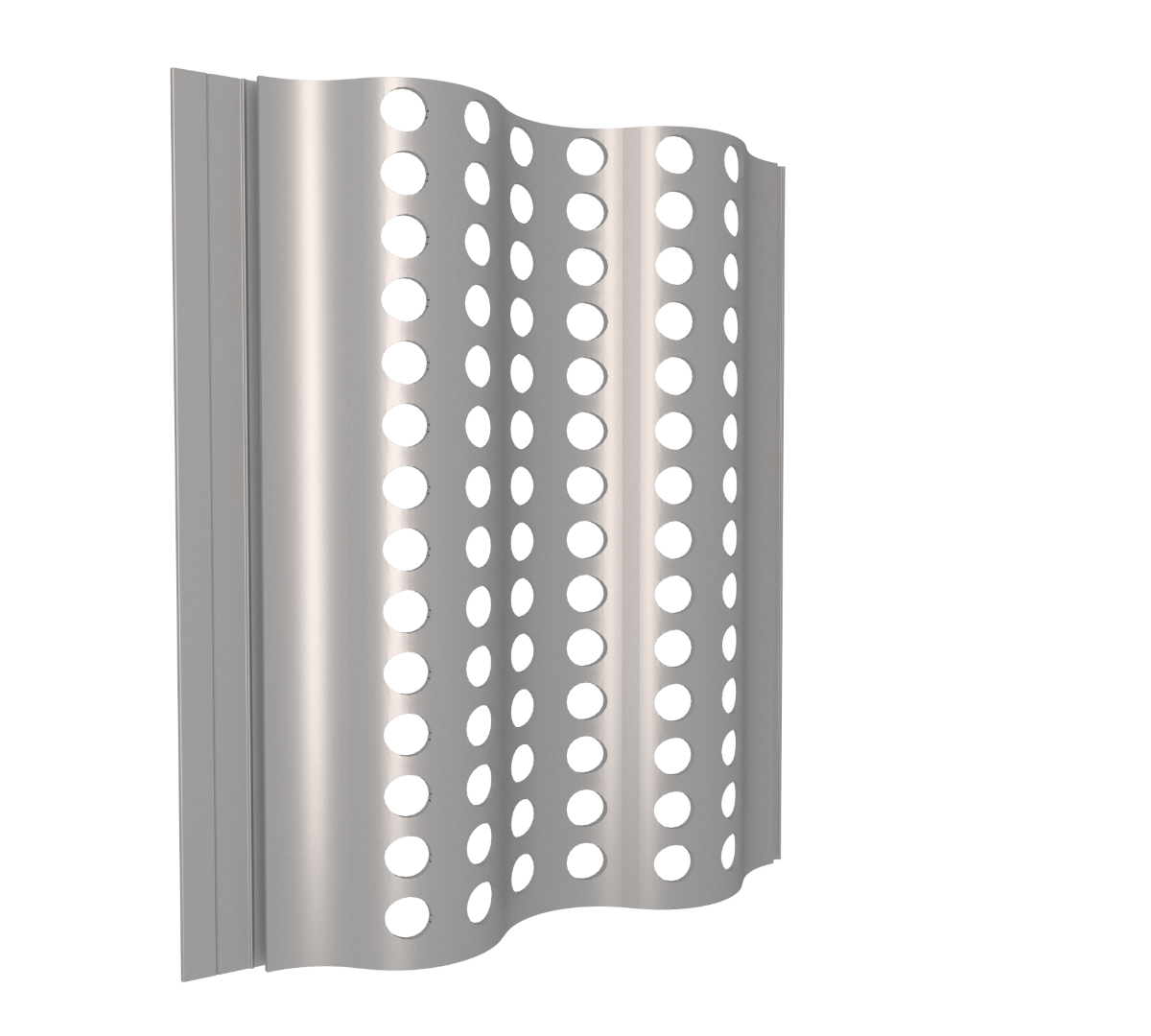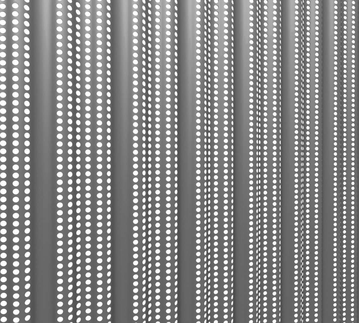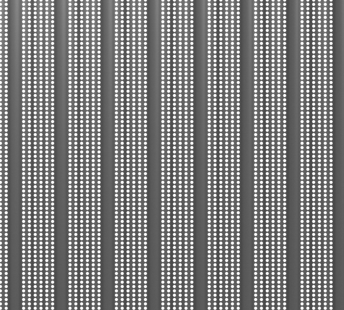 Lame d’aluminium de type ondulation, compatible avec différentes lames, permettant ainsi de réaliser des combinaisons intéressantes de reliefs différents, pour une utilisation en architecture, en bardage intérieur et extérieur et en façades ventilées. Version avec une perforation ronde de Ø10 et une surface approximative de 21,8%.