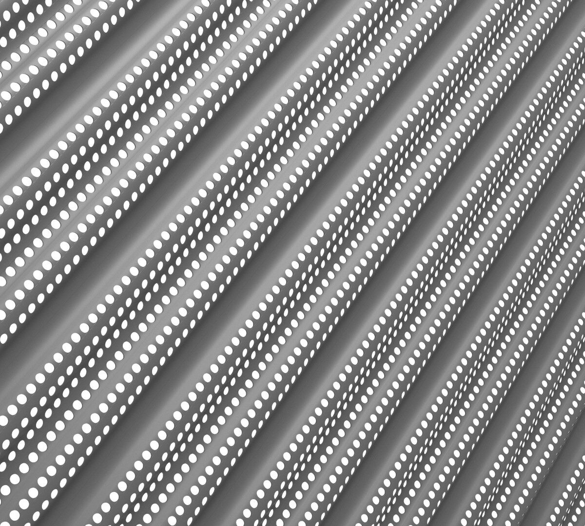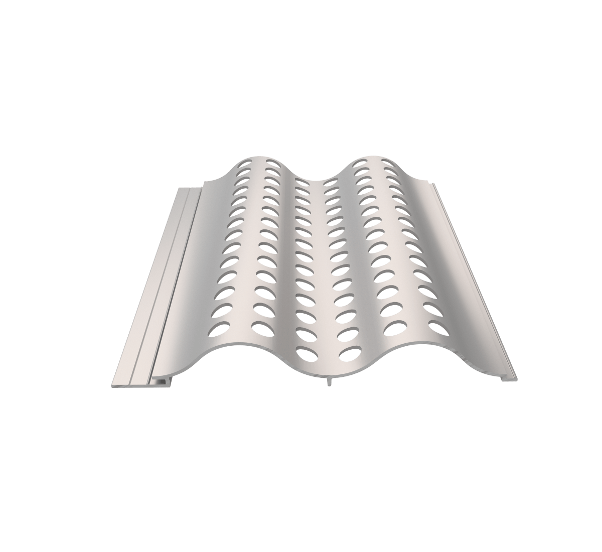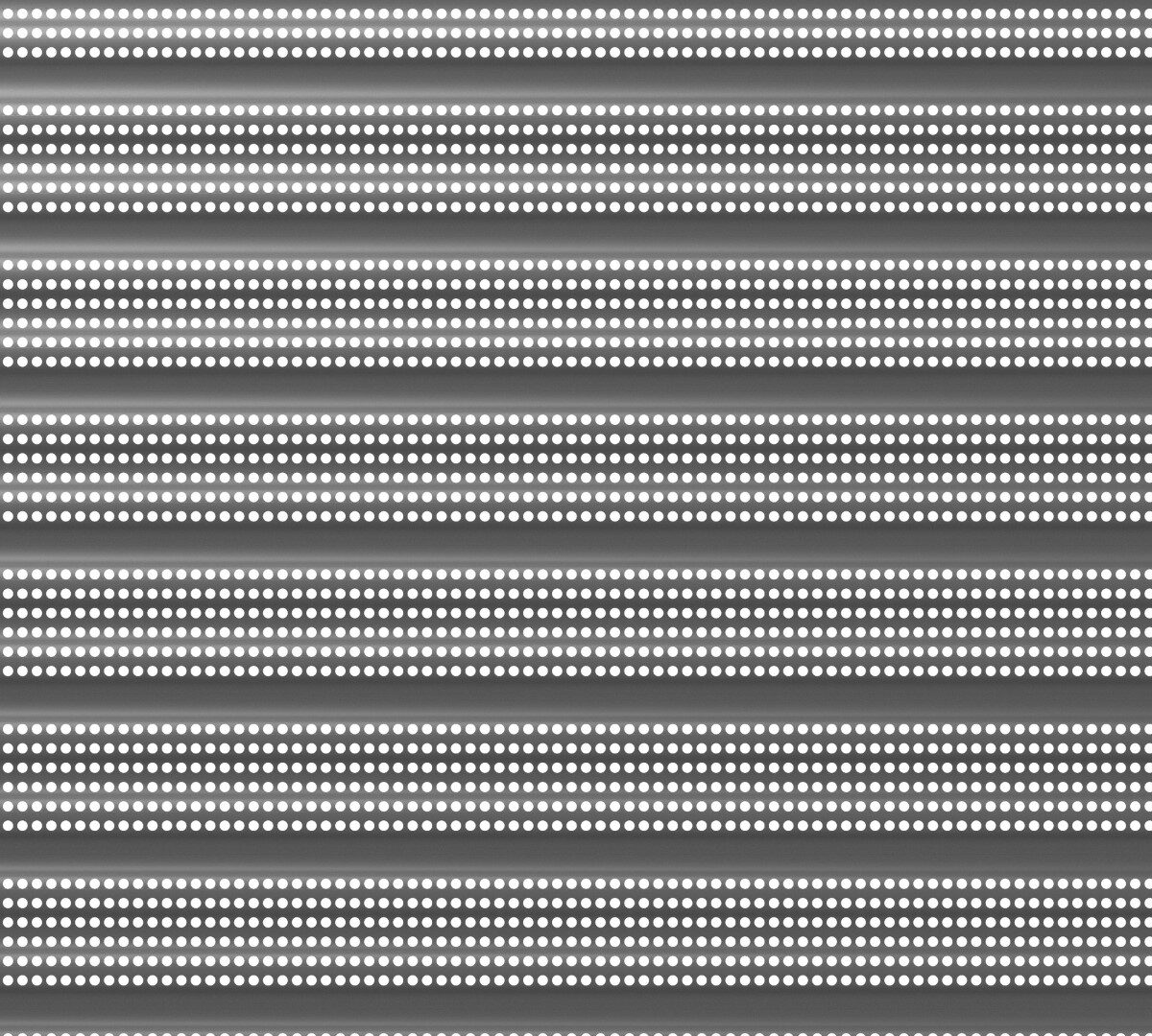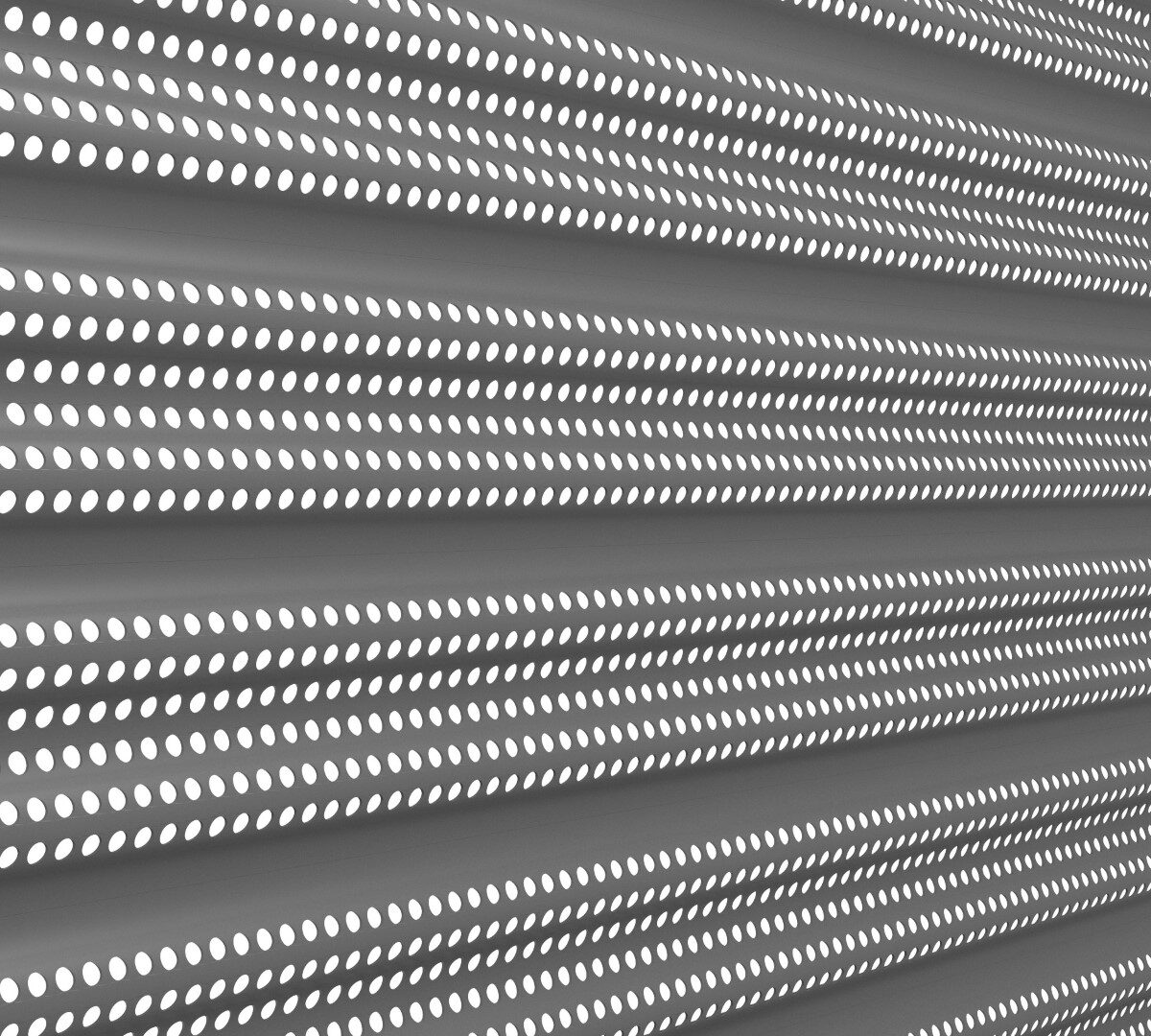 Lame d’aluminium de type ondulation, compatible avec différentes lames, permettant ainsi de réaliser des combinaisons intéressantes de reliefs différents, pour une utilisation en architecture, en bardage intérieur et extérieur et en façades ventilées. Version avec une perforation ronde de Ø10 et une surface approximative de 21,8%.