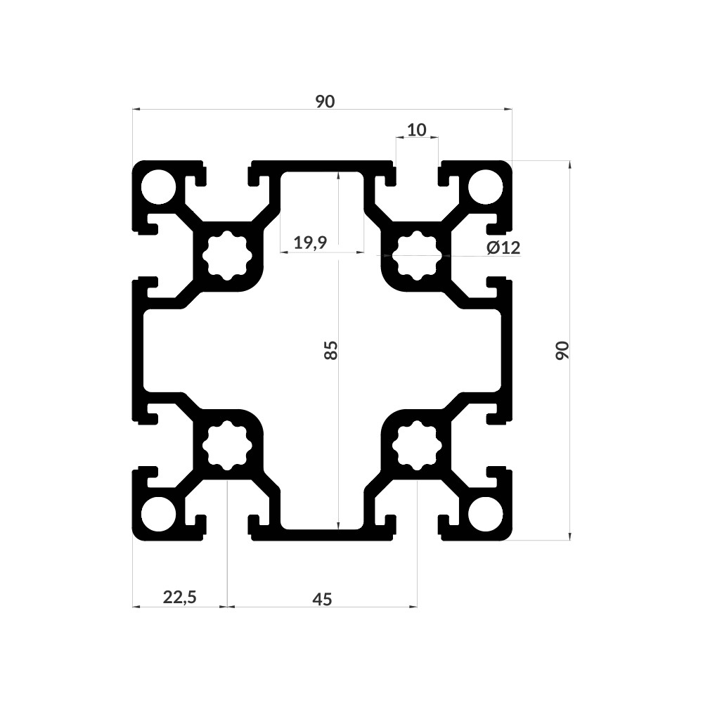 Aluskit® modular aluminium profile from the 45 Series, square 90×90 with channels distributed evenly on all sides, suitable for all types of structures. Compatible with a wide range of accessories for all types of joints and functions.