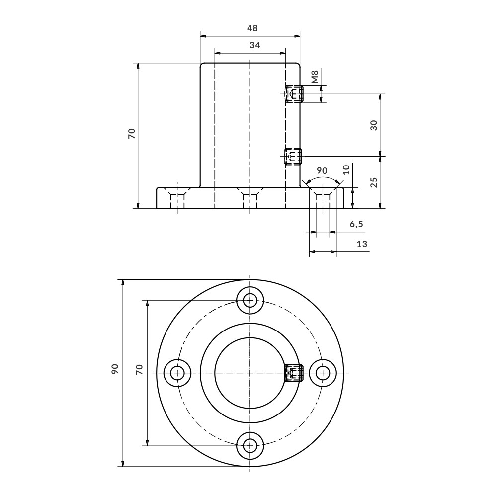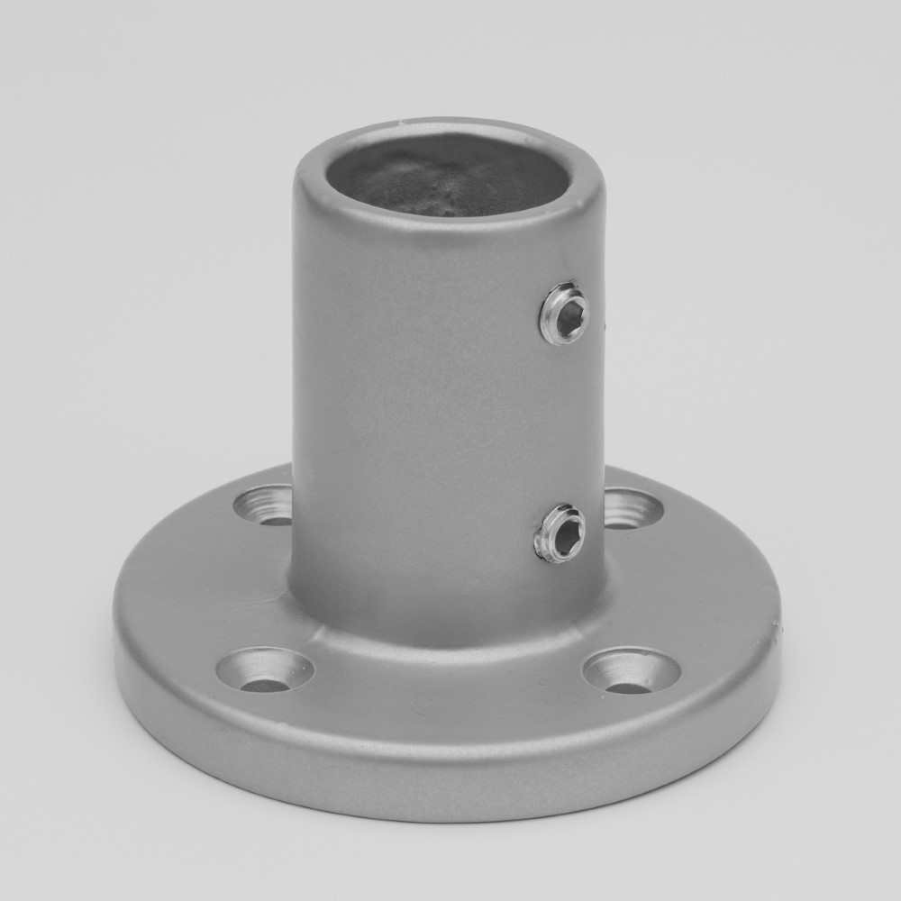 Fixing base for anchoring the tube to a surface. The tube is joined by pressing the two parts of the fitting together. The ends of the tubes must be drilled for the insertion of the fasteners.