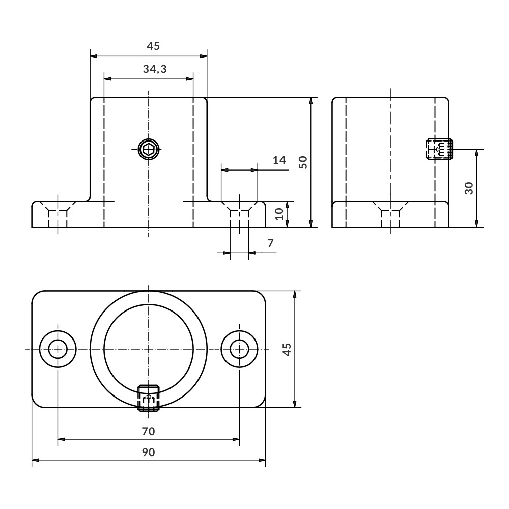 Fixing base for anchoring the tube to a surface. The tube is fixed by the pressure exerted by the captive screws. No machining of the tubes is required.