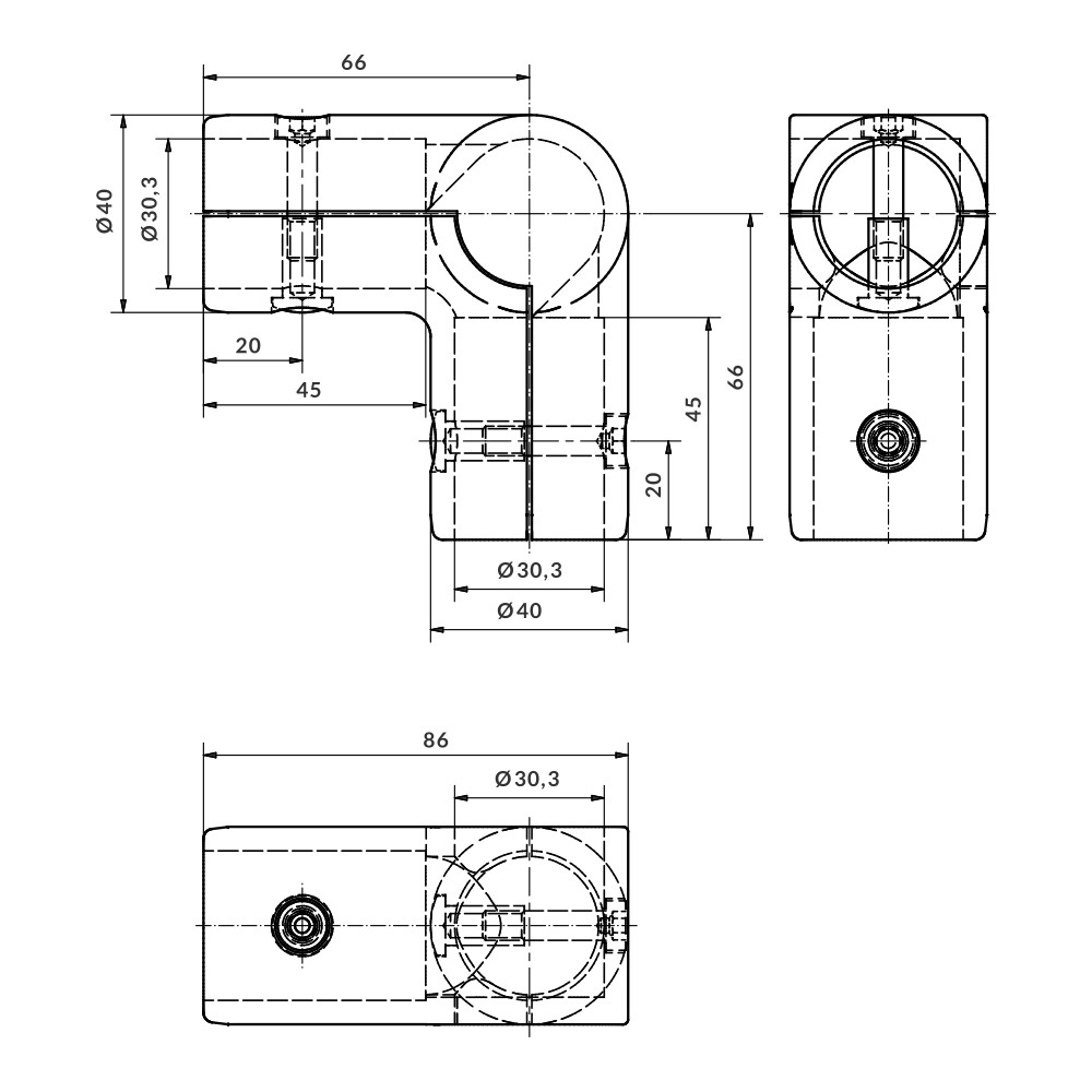 Fitting for connecting three end tubes at 90º to each other. The tubes are joined by pressing the two parts of the fitting together. The ends of the tubes must be drilled for the insertion of the fasteners. Provides a robust connection.