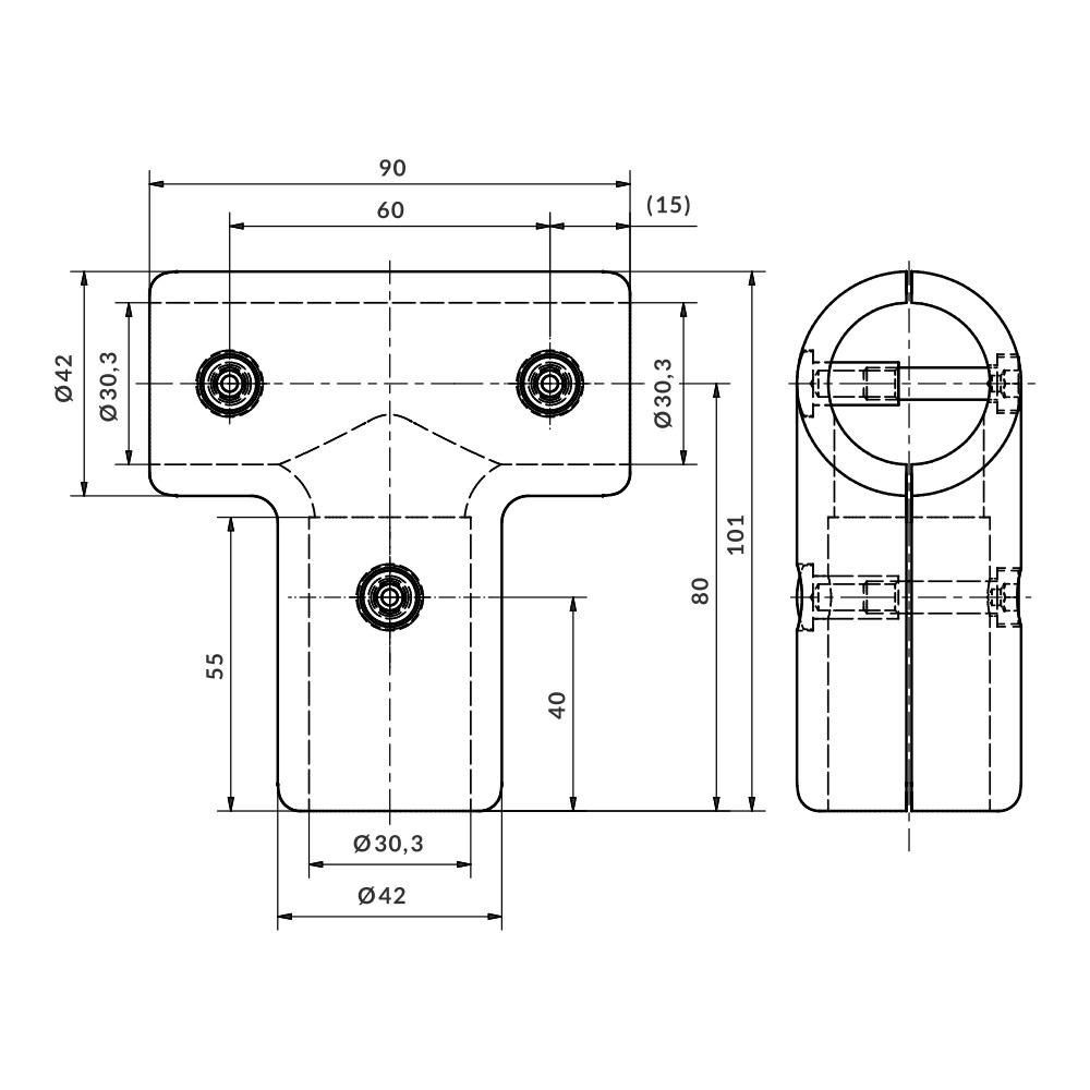 90 mm long straight T-fitting Ø30