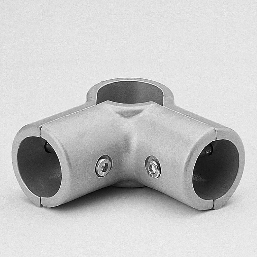 Fitting for connecting a through tube to two end tubes at 90º to each other. The tubes are joined by pressure from the two parts of the fitting. The ends of the tubes must be drilled for the insertion of the fasteners. Provides a robust connection.
