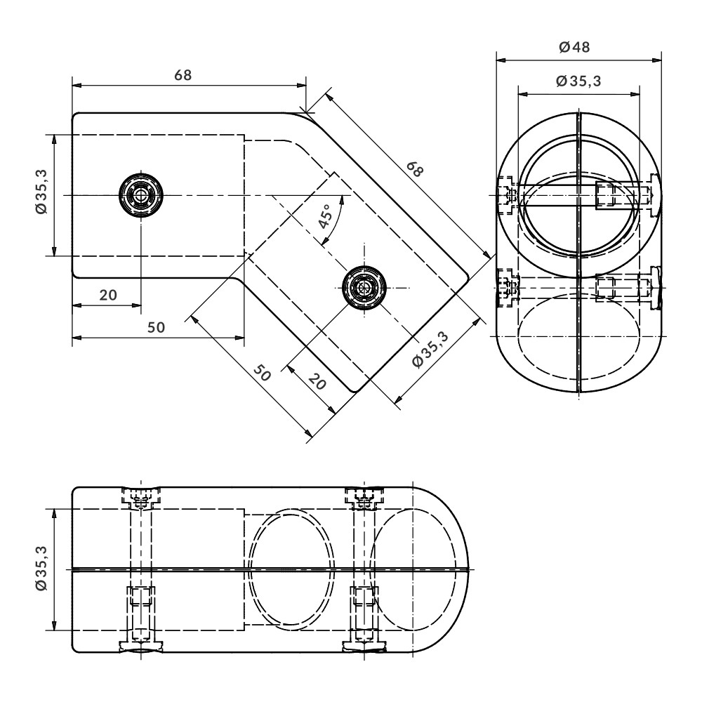 Fitting for joining two continuous end tubes at an angle of 45-135º. The tubes are joined by pressing the two parts of the fitting together. The ends of the tubes must be drilled for the insertion of the fasteners. Provides a robust connection.