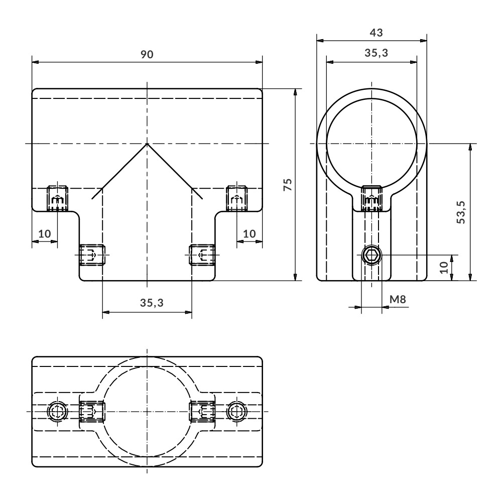 Fitting for connecting a through pipe to another terminal at 90º. They are fixed by pressure exerted by grub screws. No machining of the pipes is required.