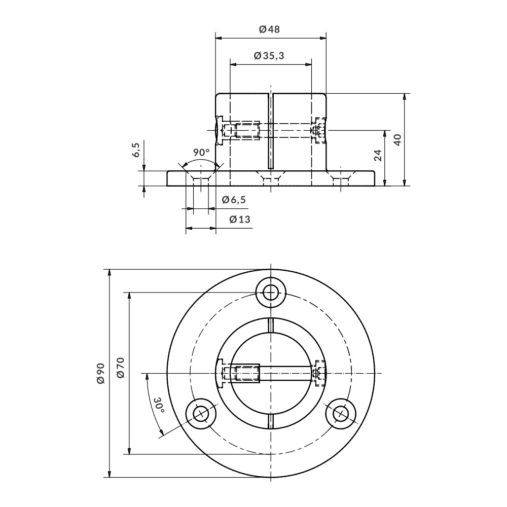 Home > Products > Aluminium fittings > Aluskit® fittings > Vertical support base fitting 3 fasteners Ø35