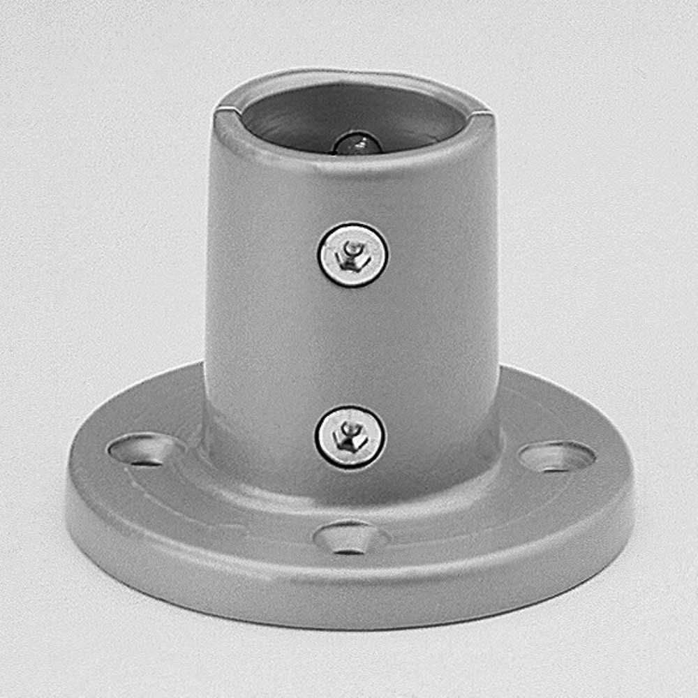Fixing base for anchoring the tube to a surface. The tube is joined by pressing the two parts of the fitting together. The ends of the tubes must be drilled for the insertion of the fasteners.