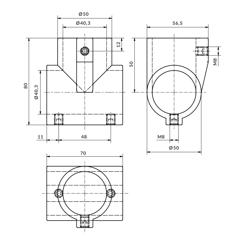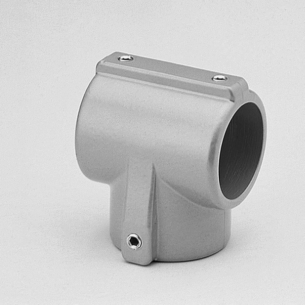 Fitting for connecting a through pipe to another terminal at 90º. They are secured by pressure exerted by grub screws. No machining of the pipes is required.