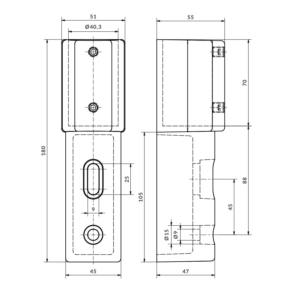 Home > Products > Aluminium fittings > Aluskit® fittings > Cylindrical side support base with lower fixing Ø40