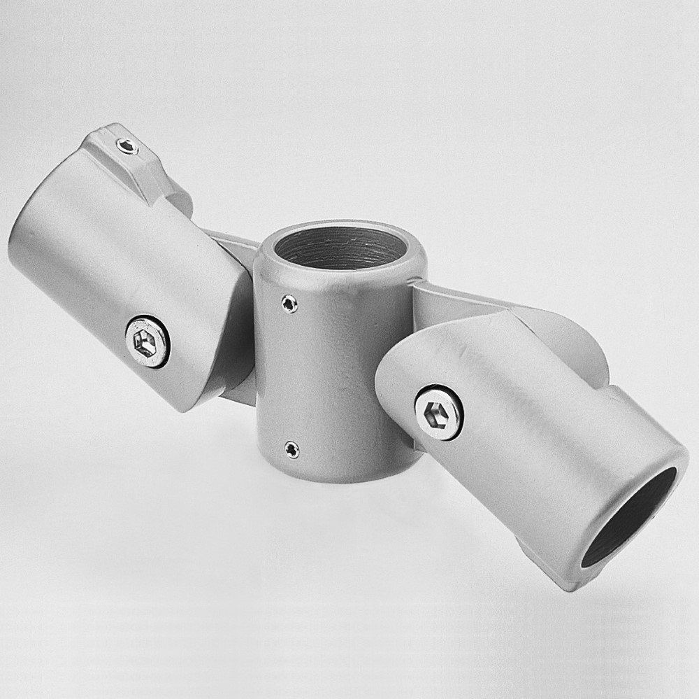 Fitting for connecting a through tube to two end tubes with a variable angle between them. The tubes are secured by pressure exerted by captive fasteners. No machining of the tubes is required.