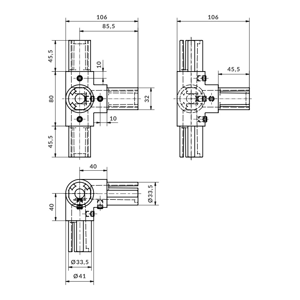 Fitting for 90º corner connection and continuation of four Ø40×3 end pipes. These fittings are practically flush with the pipe. They are fixed by pressing the inner flanges nd tightening with captive fasteners. No machining of the pipes is required.
