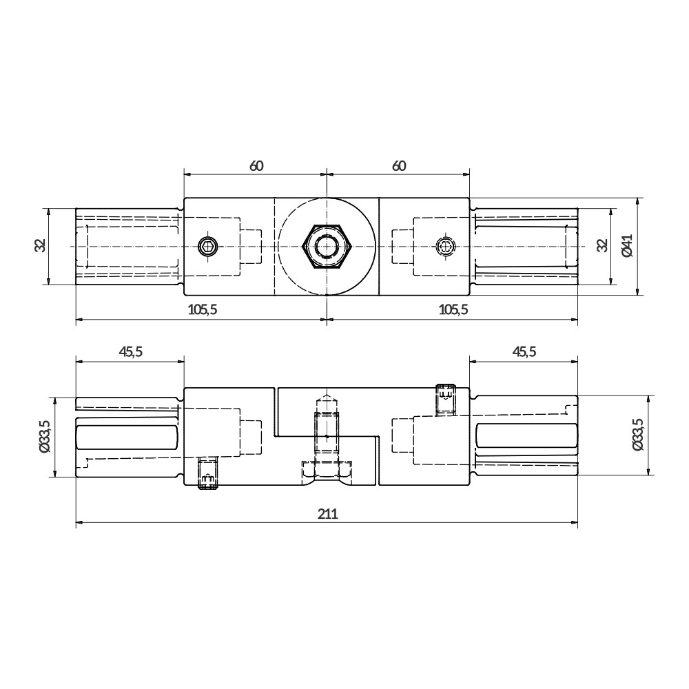 Fitting for variable angle connection of two Ø40×3 end pipes. These fittings are practically flush with the pipe. They are fixed by pressing the inner flanges and tightening with captive fasteners. No machining of the pipes is required.
