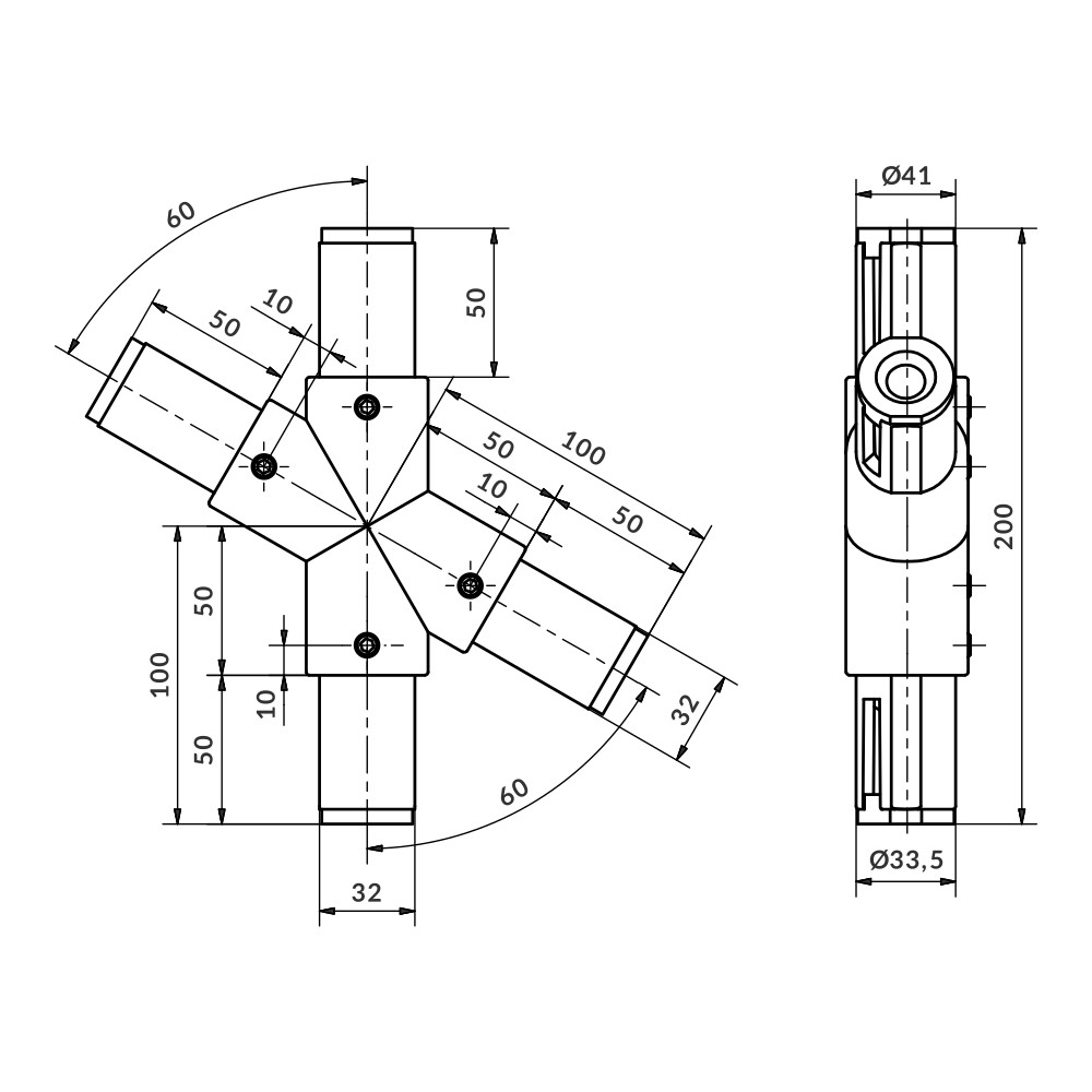 Cross fitting for 60-120º connection of four Ø40×3 end pipes. These fittings are practically flush with the pipe. They are fixed by pressing the inner flanges and tightening with captive fasteners. No machining of the pipes is required.