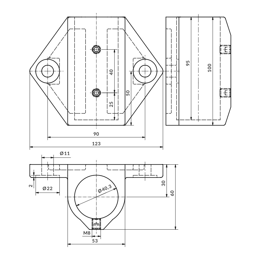 Home > Products > Aluminium fittings > Aluskit® fittings > Side terminal support base 2 fasteners Ø40