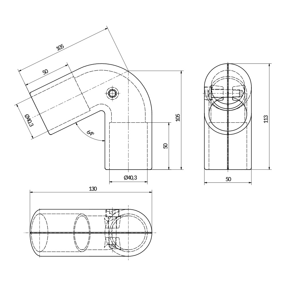 Home > Products > Aluminium fittings > Aluskit® fittings > 64º elbow 105×105 1 fastener Ø40