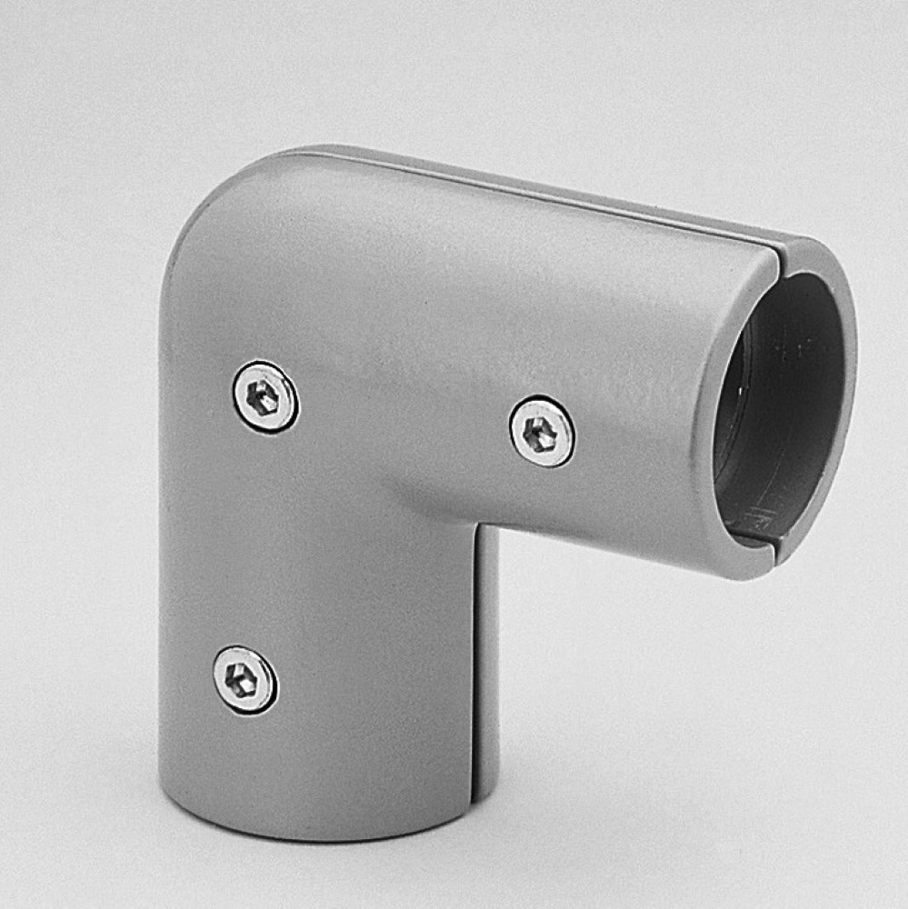Elbow fitting for connecting two end tubes at 90°. They are joined by pressing the two parts of the fitting together. The tubes must be drilled for the insertion of the fasteners. Provides a robust connection.