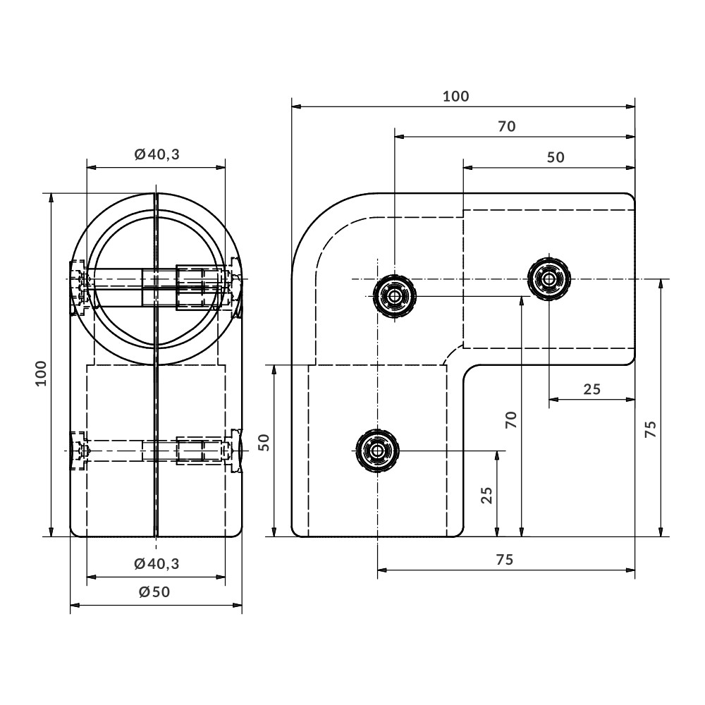 Home > Products > Aluminium fittings > Aluskit® fittings > 90º elbow 100×100 3 fasteners Ø40