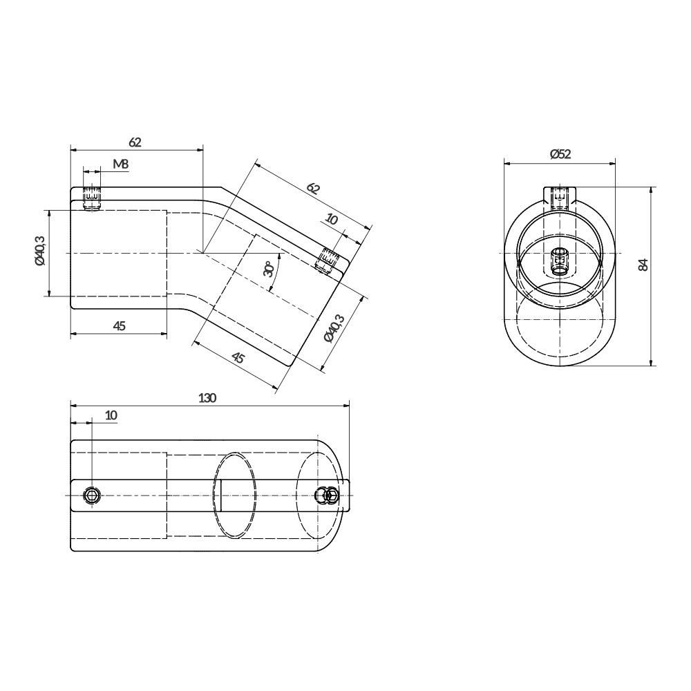 Fitting for connecting two continuous end tubes at an angle of 30-150º. They are secured by the pressure exerted by the fasteners. No machining of the tubes is required.