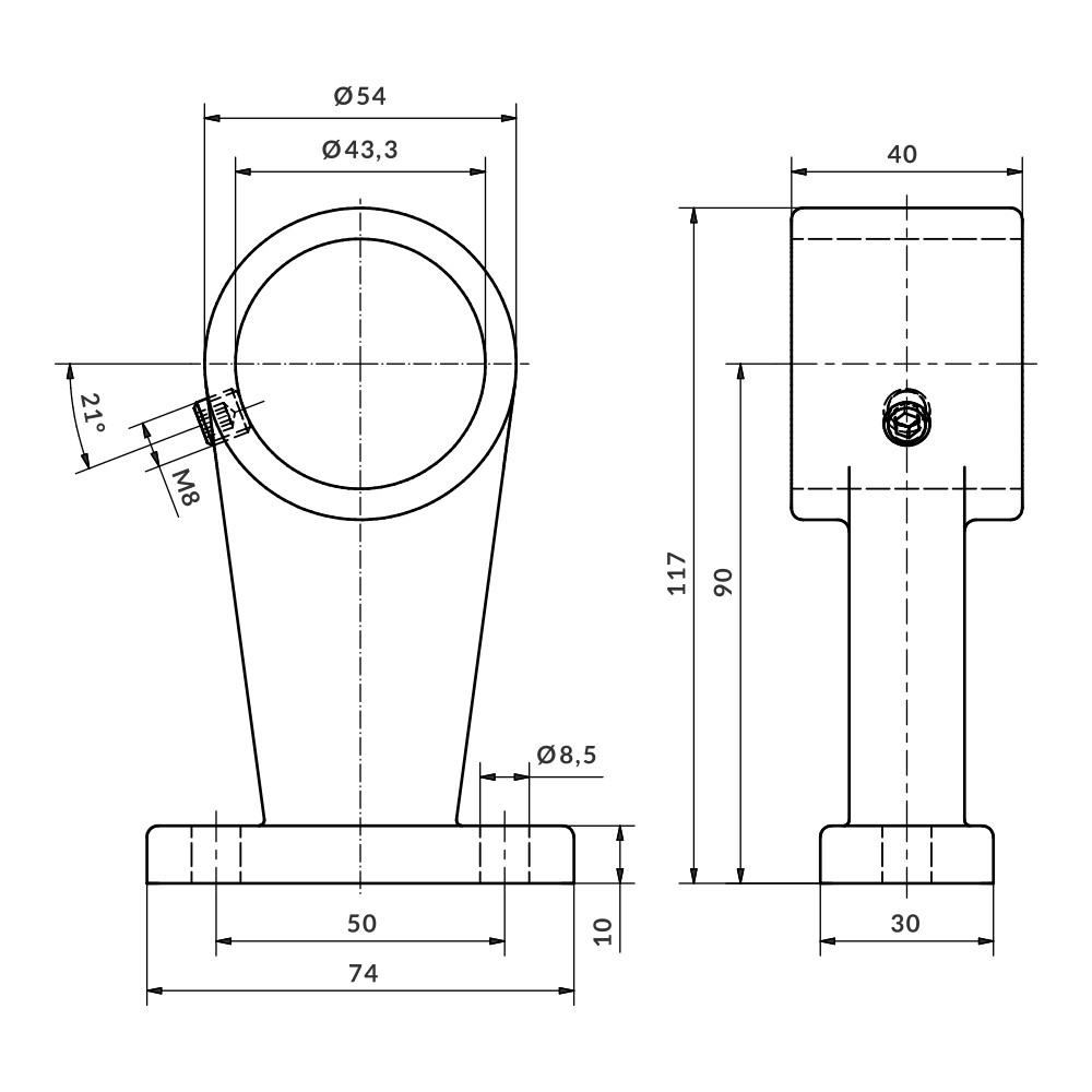 Fitting for fixing a tube parallel to the surface. Fastened by pressure of the captive fastener. No machining of the tubes required.