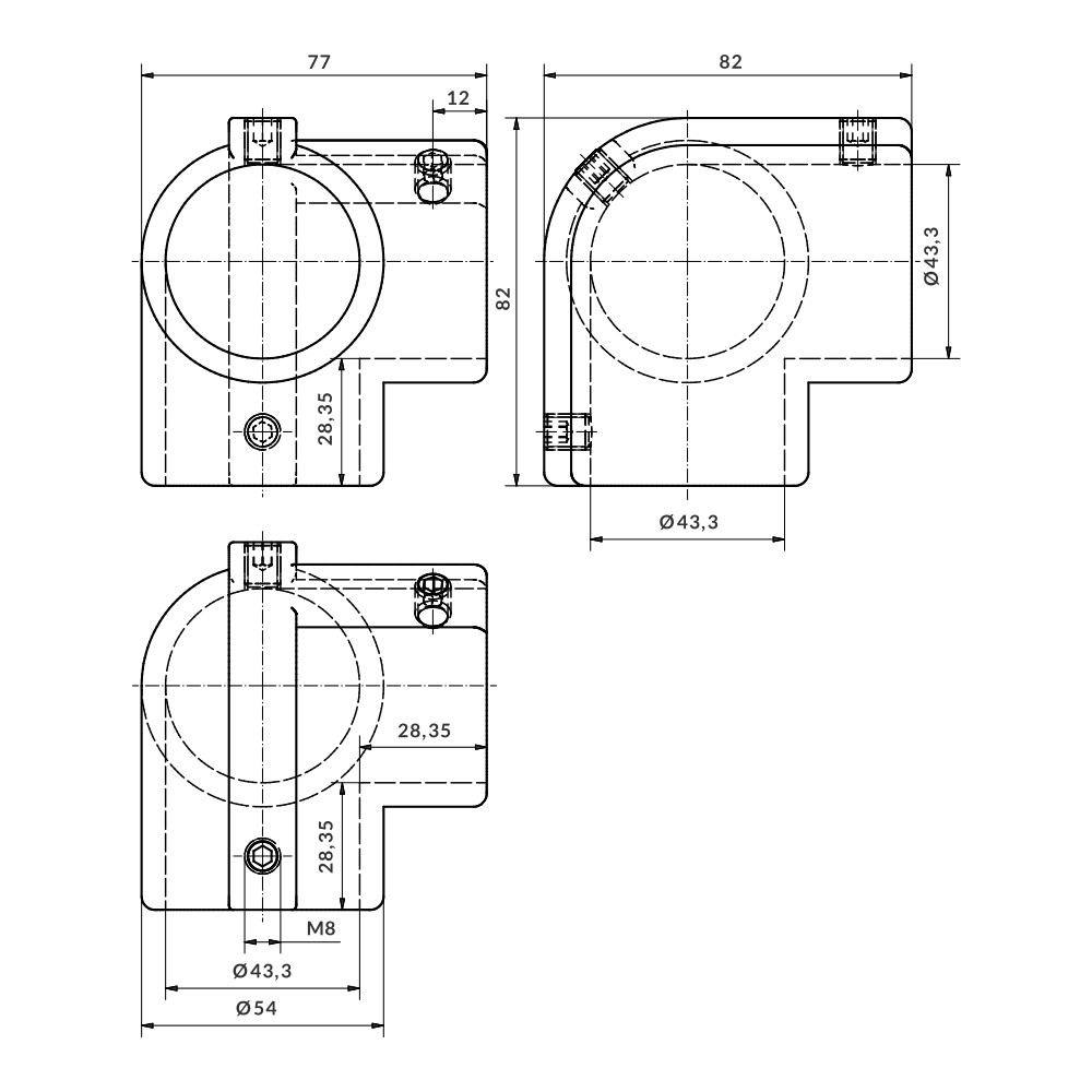 Fitting for connecting three end tubes at 90°. They are secured by pressure from captive fasteners. No machining of the tubes is required.
