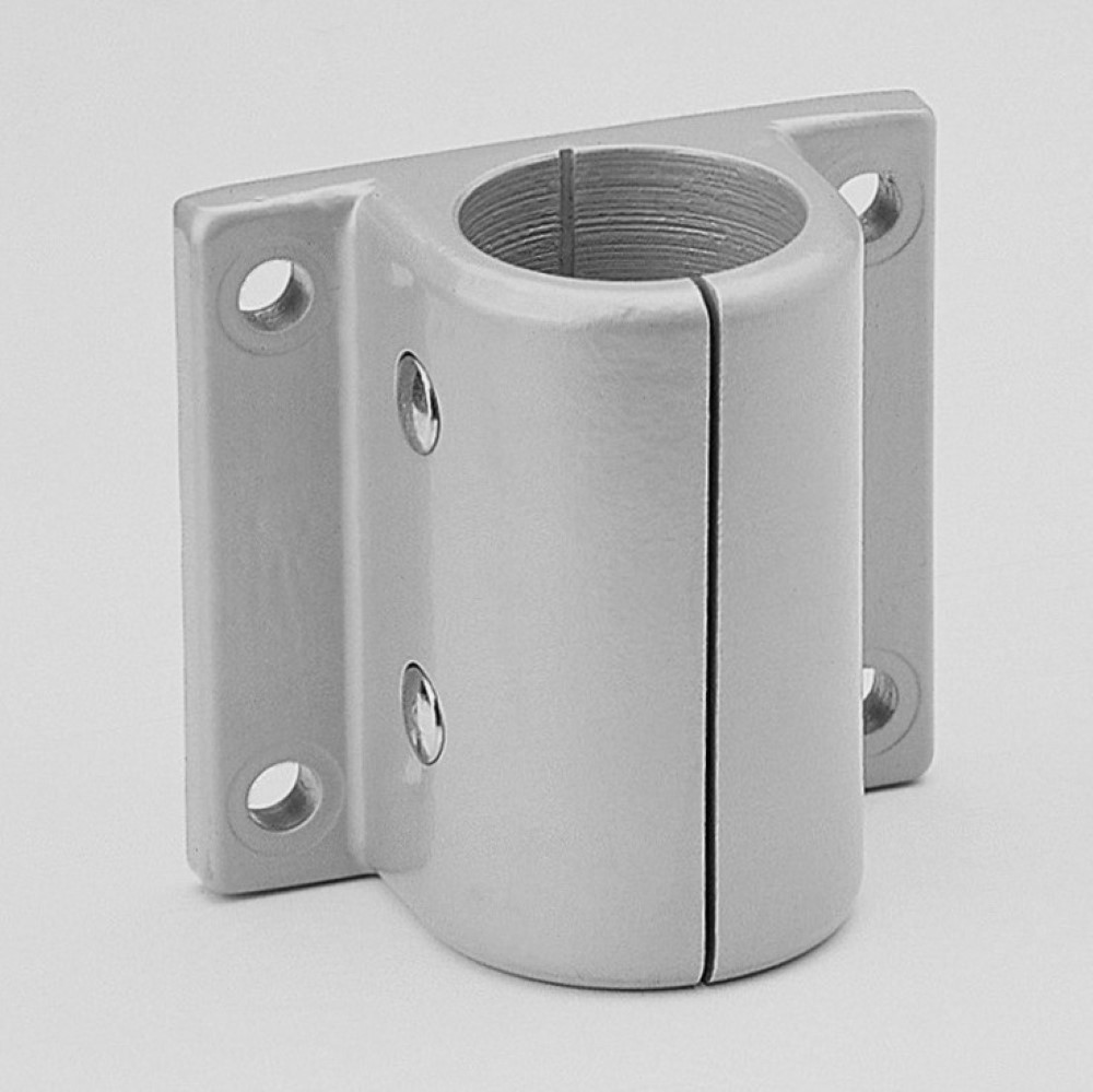 Fixing base for supporting a through tube on a vertical surface. The tube is joined by pressing the two parts of the fitting together. The tube must be drilled for the insertion of the fasteners. Provides a robust connection.