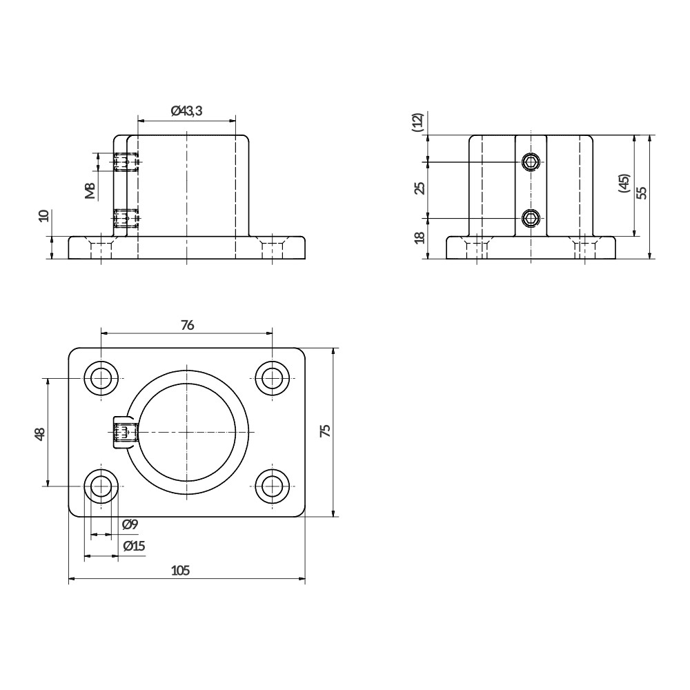Fixing base for anchoring the tube to the surface, with 4 anchoring points. The tube is fixed by pressure exerted by captive fasteners. No machining of the tubes is required.