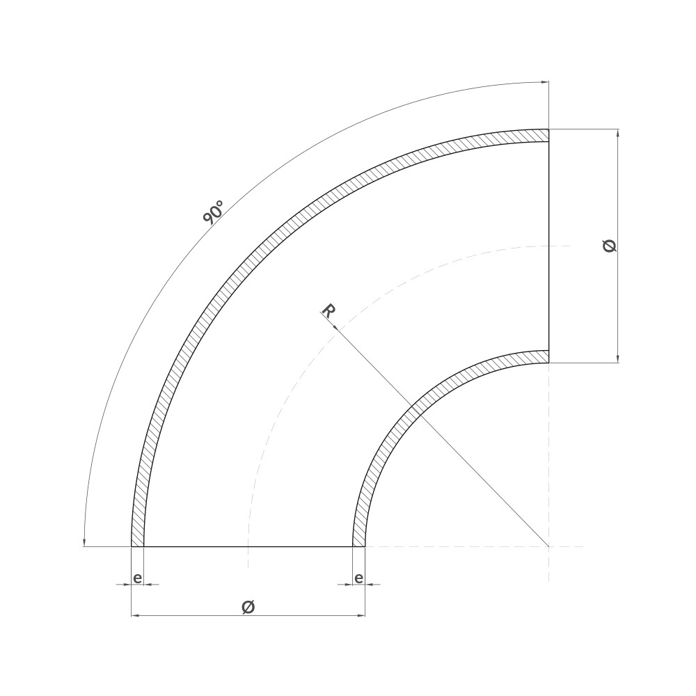 90° aluminium elbow made of alloy 5754 H112, seamless, in accordance with EN 754/755 and with a design similar to DIN 2605. Suitable for use in piping systems and tankers.