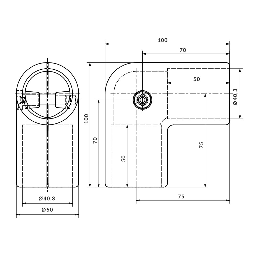 Home > Products > Aluminium fittings > Aluskit® fittings > 90º elbow 100×100 1 fastener Ø40