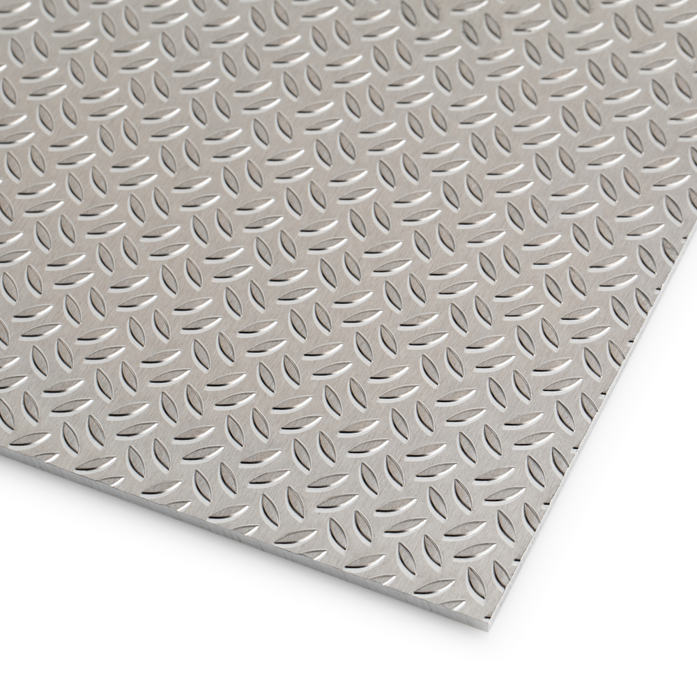 Rice grain aluminium anti-slip sheet. Its relief pattern allows it to be used as an anti-slip, impact protection and decorative coating.