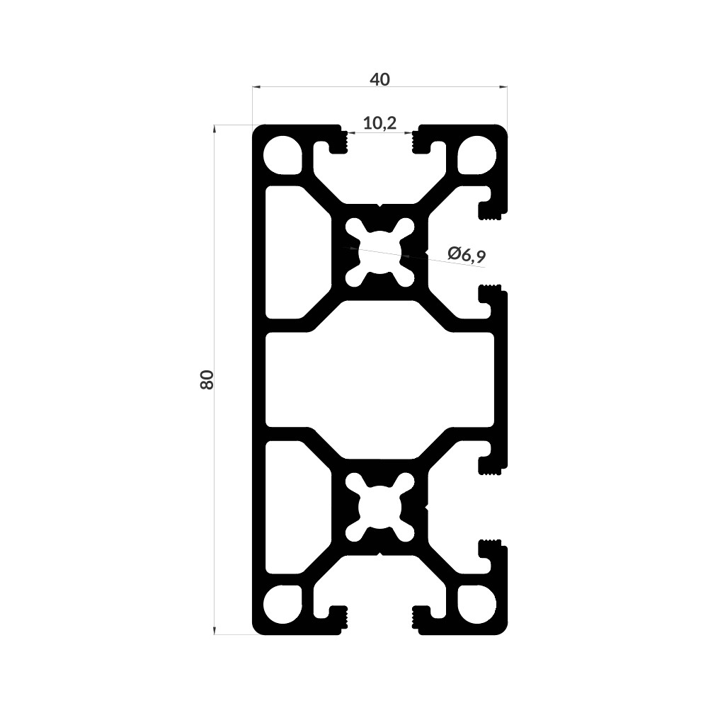 Profilé modulaire en aluminium Aluskit® de la série 40, rectangulaire, avec quatre canaux répartis uniformément sur trois des faces, dont une lisse, adapté à la réalisation de tous types de structures. Compatible avec une large gamme d’accessoires pour tous types d’assemblages et de fonctionnalités.