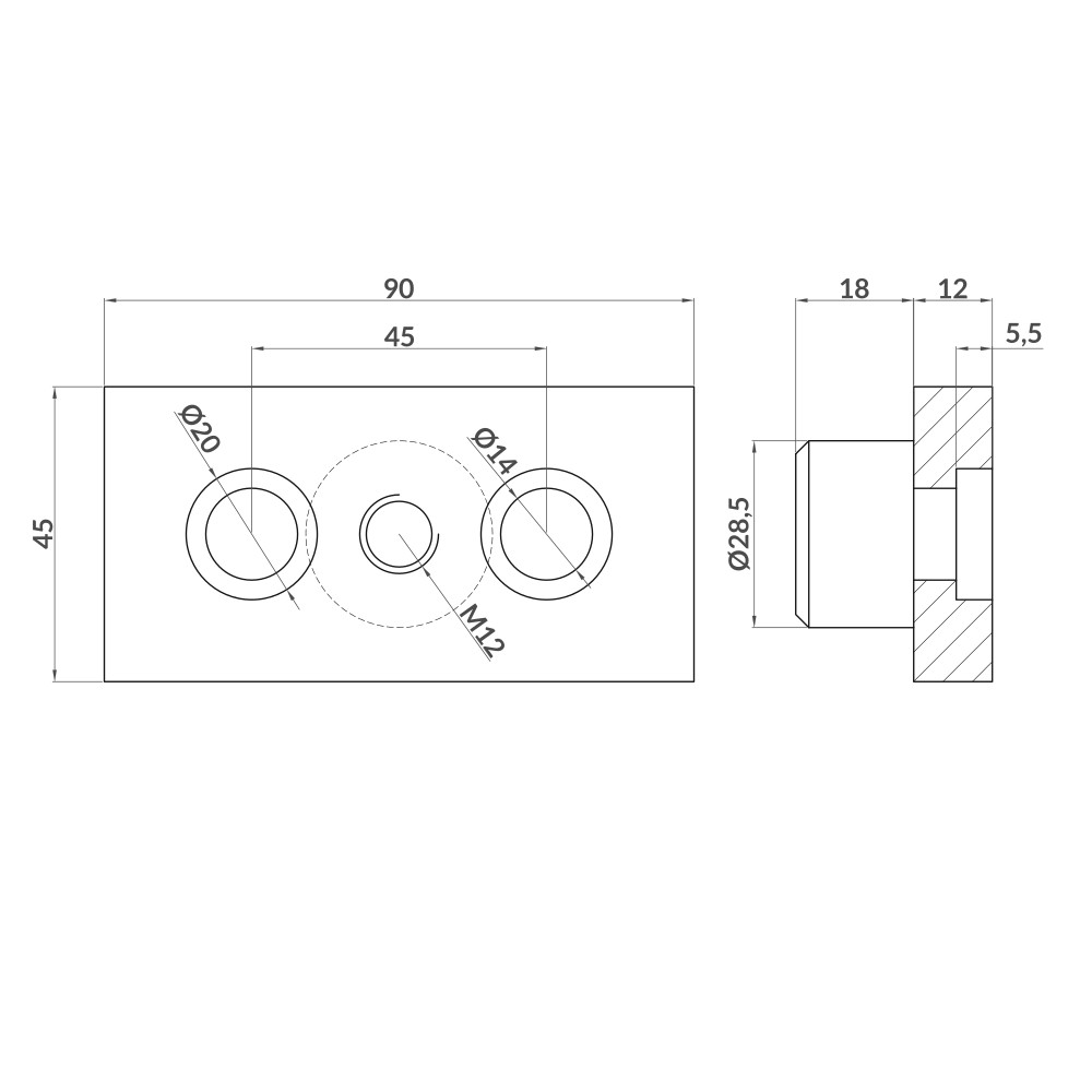 Plaque de base renforcée en aluminium pour le profilé Aluskit® 90×45 qui permet d’installer de manière centrée un pied ou une roulette à la base de celui-ci.