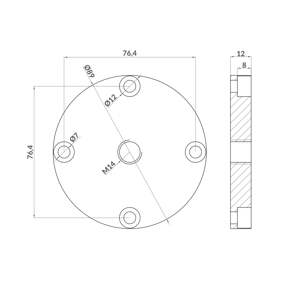 Plaque de base lisse en aluminium pour le profil Aluskit® rond Ø89 avec référence 140133 qui permet d’installer de manière centrée un pied ou une roulette à la base de celui-ci.