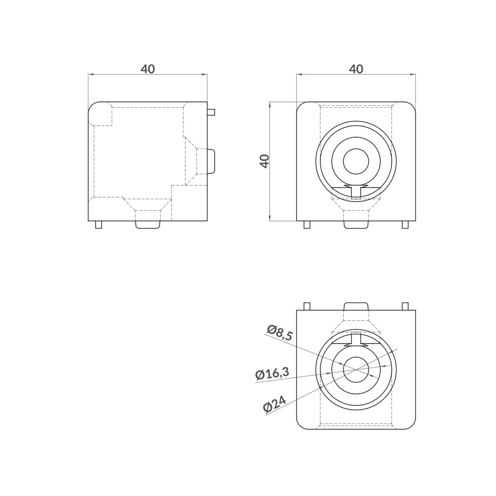Raccord pour réaliser des angles à 90° entre deux profilés modulaires en aluminium du système Aluskit® 40×40. La vis autotaraudeuse nécessaire au montage n’est pas fournie.