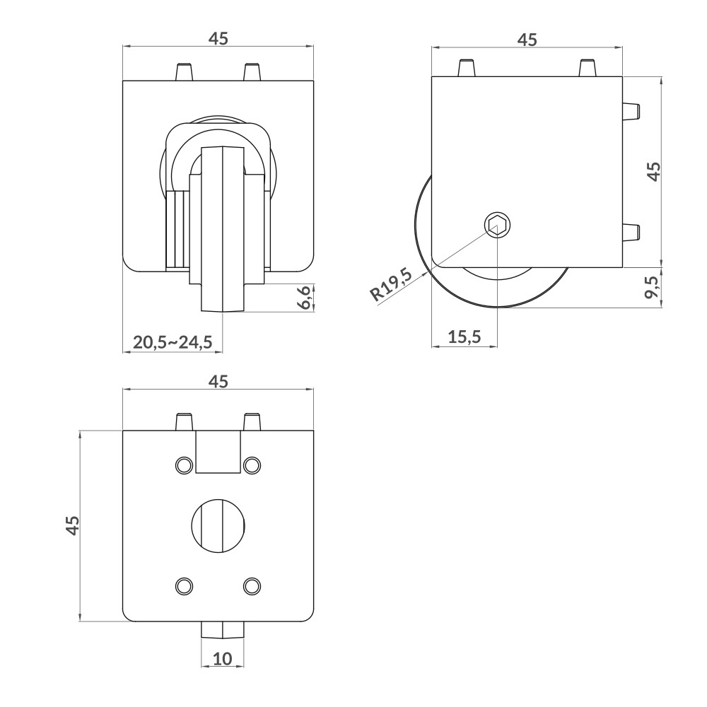 Cube d’assemblage à 2 voies intégrant une roulette qui permet de réaliser des structures coulissantes guidées dans un autre profilé avec rainure de 10. Compatible avec les profilés 45×45.