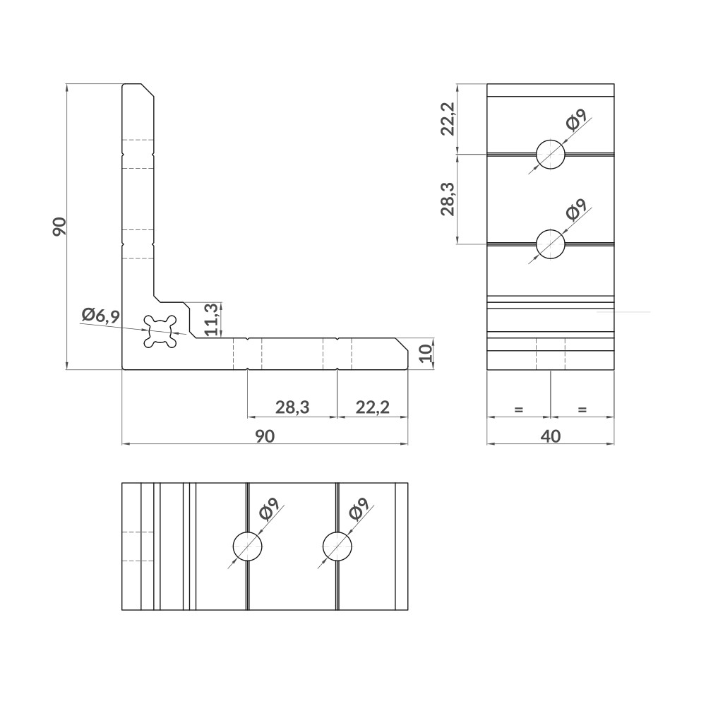 Équerre en aluminium fabriquée à partir d’un profilé extrudé. Idéale pour des assemblages robustes de profilés à 90°. Particulièrement compatible avec les profilés modulaires en aluminium Aluskit® de 45 mm de côté. Les vis ne sont pas fournies, elles doivent être choisies en fonction du montage à réaliser.