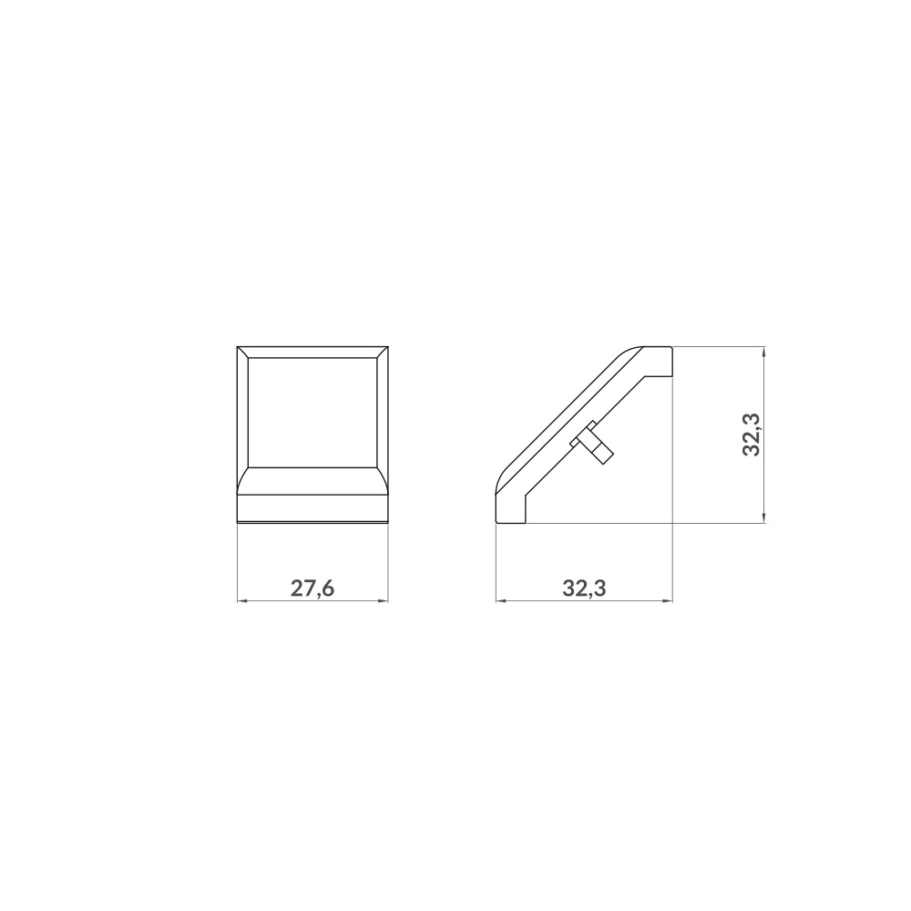 Couvercle pour cornière en aluminium injecté 27x27x28. De couleur noire. S’installe en appuyant sur le couvercle contre la cornière.