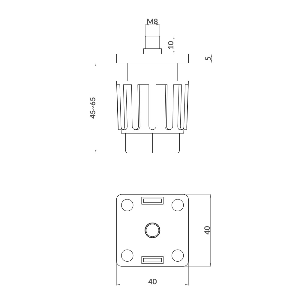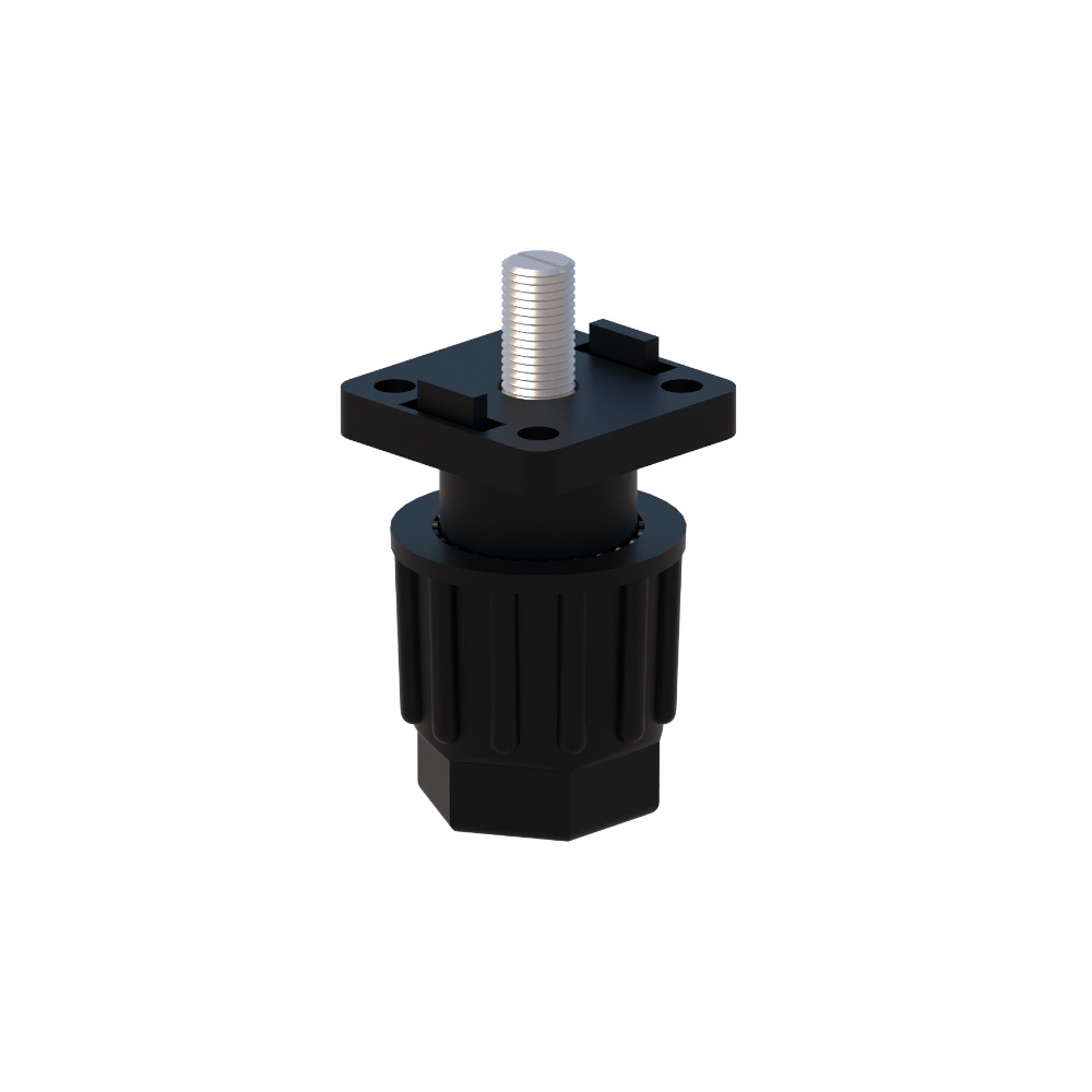 Pied réglable spécialement conçu pour être installé dans la nervure de la section des profilés modulaires en aluminium Aluskit® de 40×40. Il s’installe en le vissant dans la nervure centrale des profilés. Sa hauteur est variable de 45 à 65 mm.