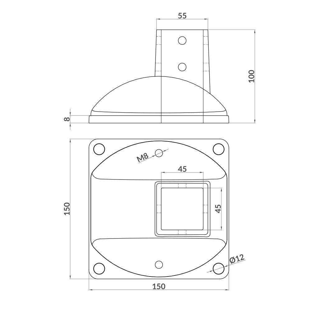 Base d’ancrage compatible avec les profilés modulaires en aluminium Aluskit® 45×45. Également compatible avec les tubes carrés standard 45×45. Ne comprend pas les fixations à la surface.