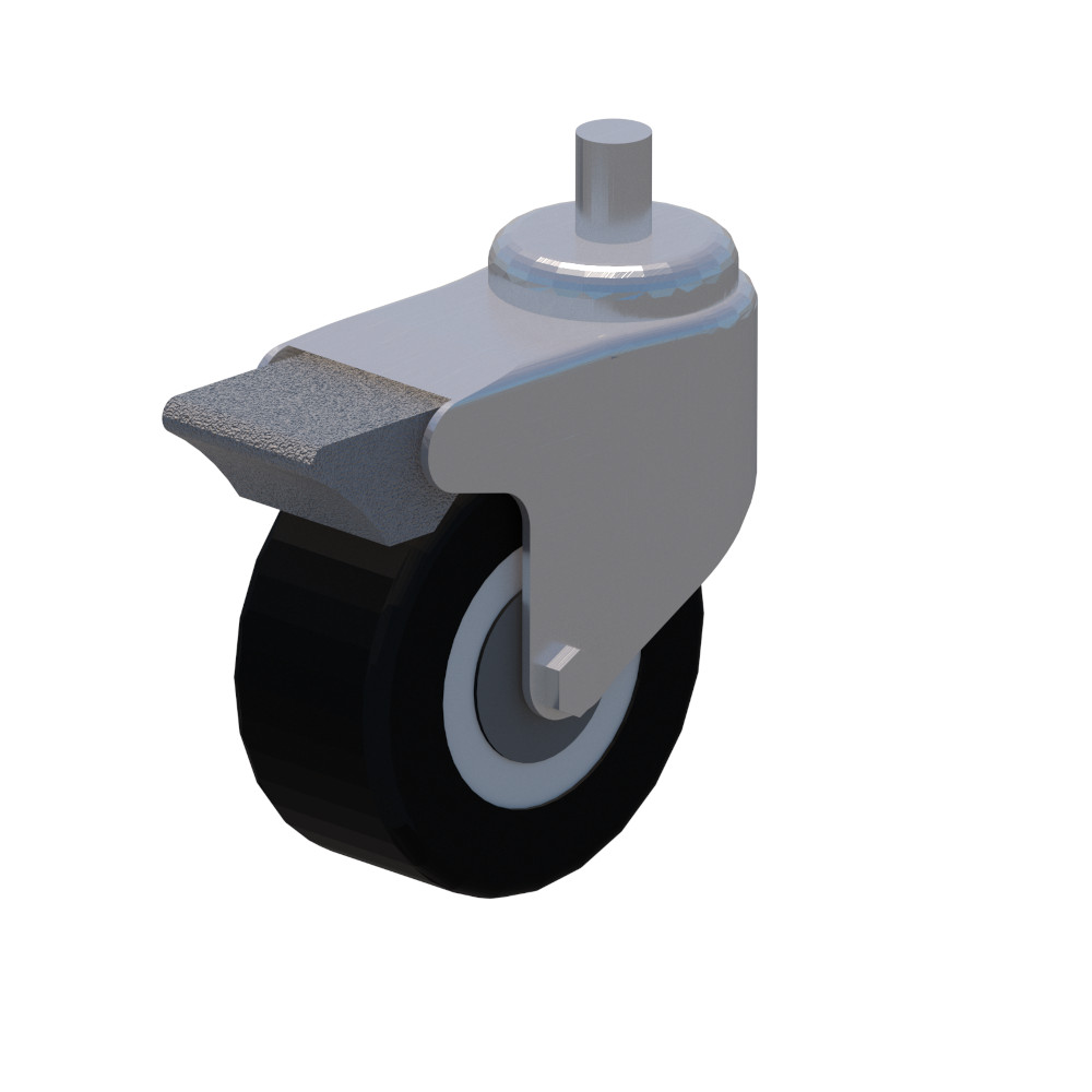 Roue avec bandage en caoutchouc gris anti-trace, raccord pivotant et frein. Indiquée pour être fixée à l’aide d’une vis M8 aux profilés modulaires en aluminium du système Aluskit® des séries 30 et 40.