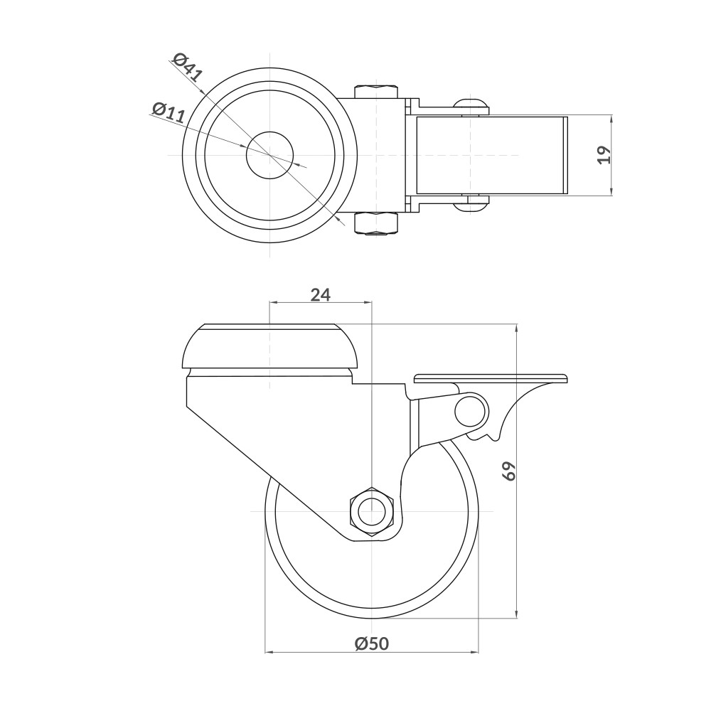 Roue en caoutchouc gris Ø50×19 pivotante avec frein S30/40