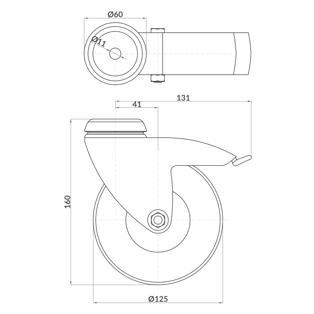 Roue en caoutchouc gris Ø125×32 pivotante avec frein S30/40