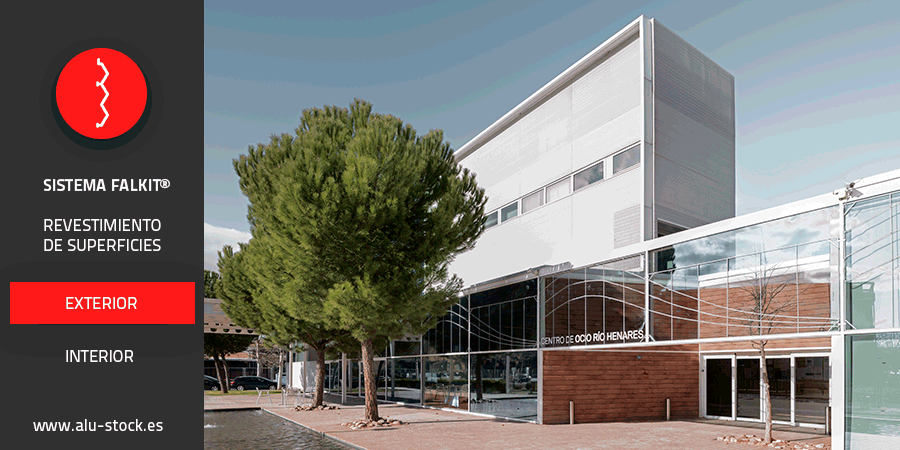 Sistema Falkit para revestimiento de todo tipo de superficies. Gracias a sus posibilidades, este sistema de aluminio es idóneo para la utilización tanto en exteriores, como revestimientos de fachadas ventiladas, otorgando entre otras, una imagen de arquitectura moderna, como en ambientes interiores, convirtiéndolo en un producto ideal para interioristas y diseñadores de interior.
