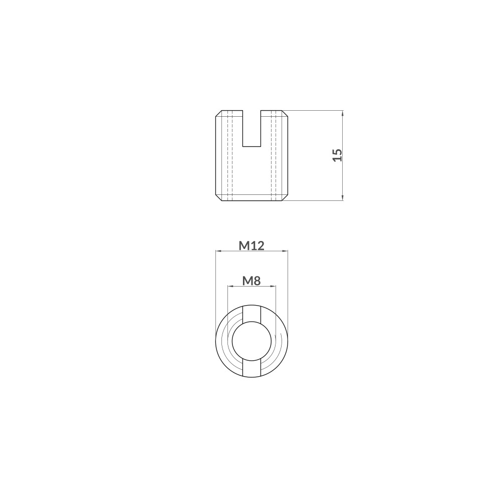 Casquillo reductor de M12 a M8 que permite insertar en los nervios de los perfiles de la Serie 45 accesorios de M8.