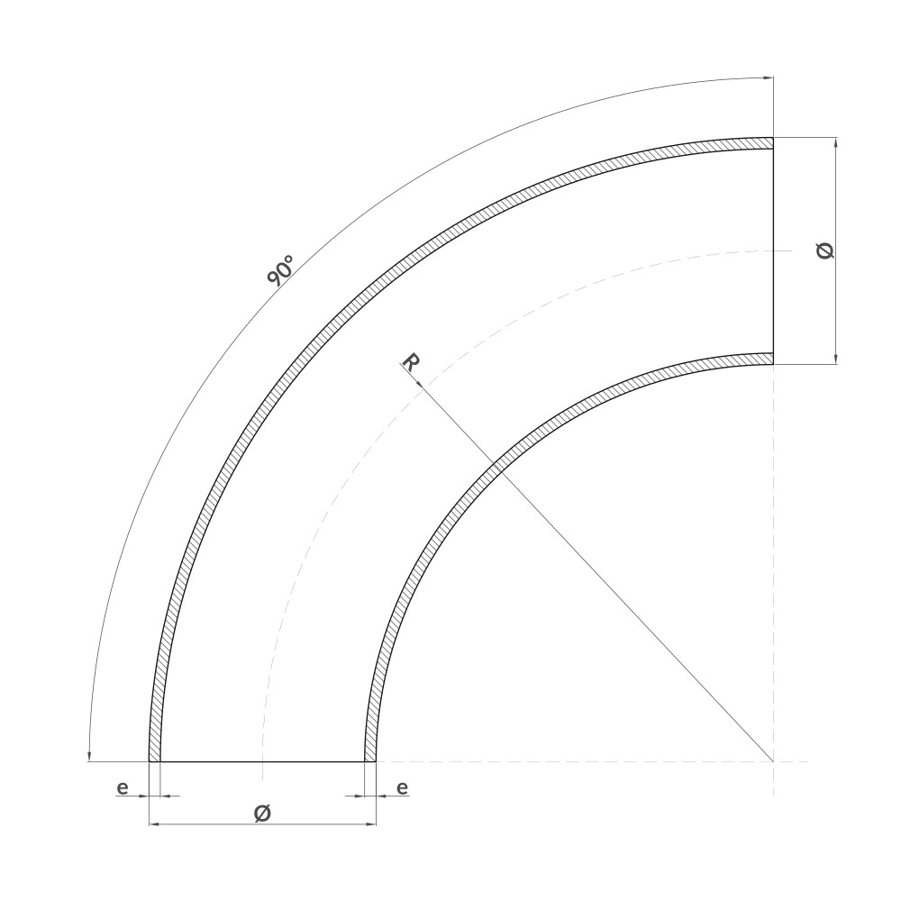 Codo de aluminio a 90º fabricado en la aleación 1050 O, sin soldadura, de acuerdo a la norma EN 754/755 y con diseño similar según la norma DIN 2605. Son adecuados para su uso en instalaciones de conducciones y vehículos cisterna.