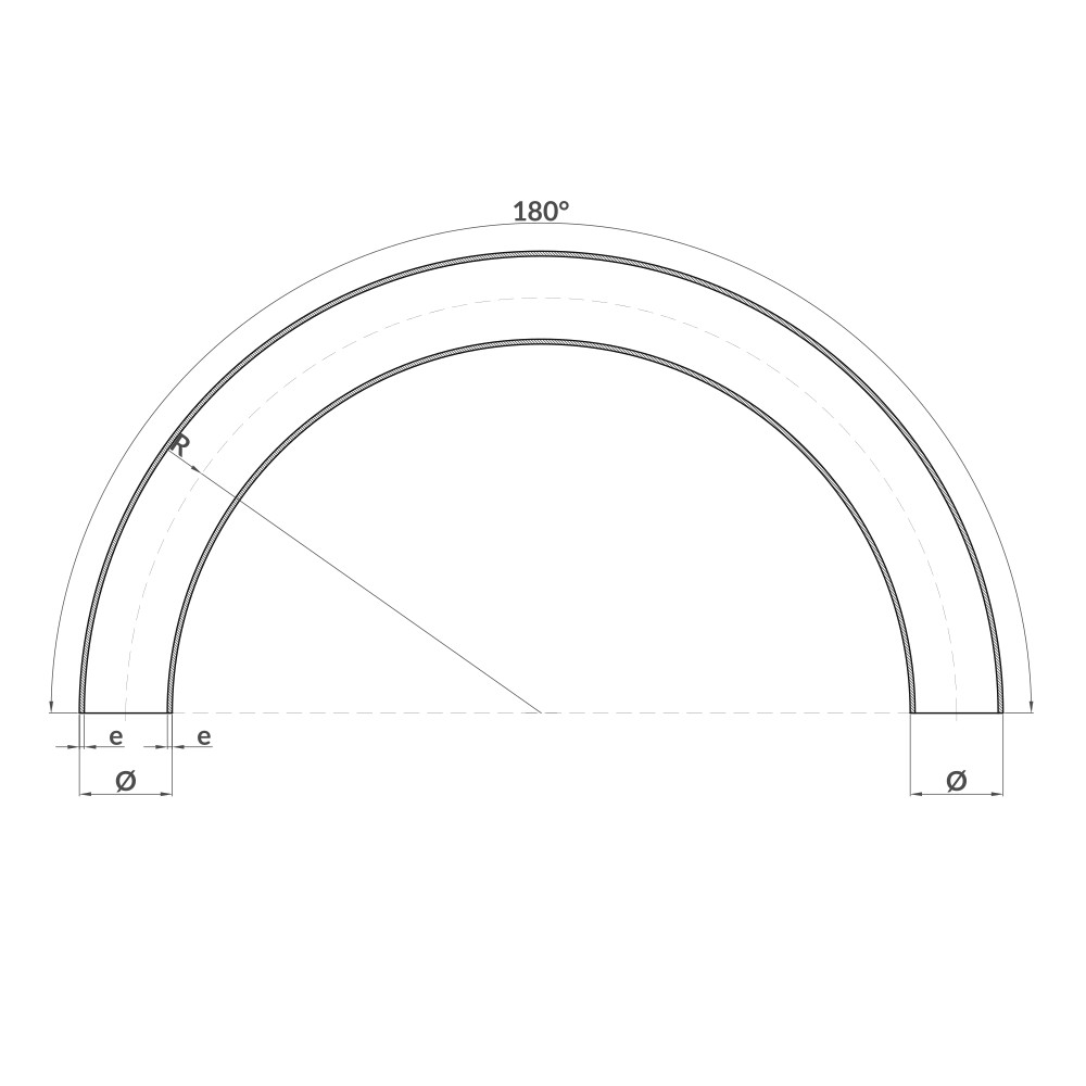 Codo de aluminio a 180º fabricado en la aleación 1050 O, sin soldadura, de acuerdo a la norma EN 754/755 y con diseño similar según la norma DIN 2605. Son adecuados para su uso en instalaciones de conducciones y vehículos cisterna.