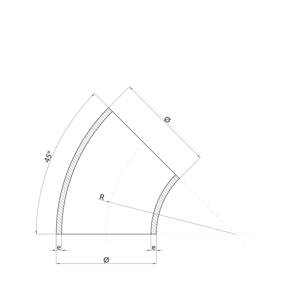 Codo de aluminio a 45º fabricado en la aleación 1050 O, sin soldadura, de acuerdo a la norma EN 754/755 y con diseño similar según la norma DIN 2605. Son adecuados para su uso en instalaciones de conducciones y vehículos cisterna.